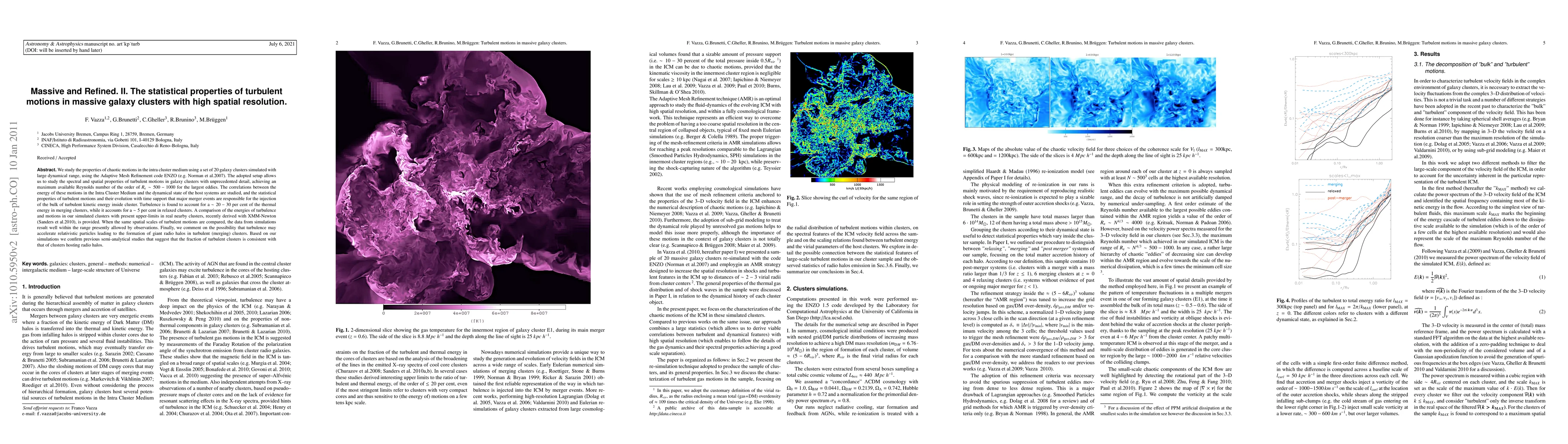 This paper investigates the statistical properties of turbulent motions in massive galaxy clusters using high-resolution simulations. The findings suggest that major merger events predominantly inject turbulent kinetic energy, with turbulence accounting for 20-30% of the thermal energy in merging clusters compared to 5% in relaxed clusters.
