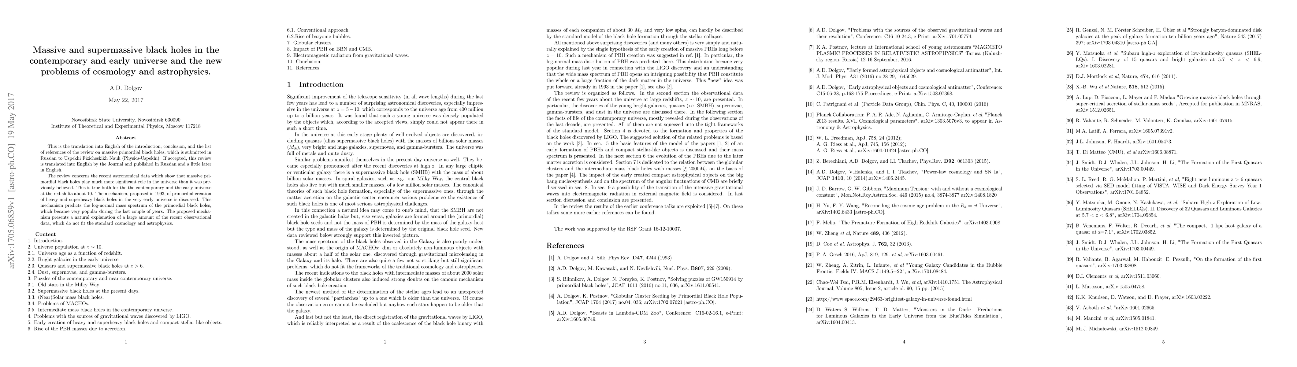 This is the translation into English of the introduction, conclusion, and the list of references of the review on massive primordial black holes, which is submitted in Russian to Uspekhi Fizicheskikh Nauk (Physics-Uspekhi). If accepted, this review is translated into English by the Journal and published in Russian and a little later in English. The review concerns the recent astronomical data which show that massive primordial black holes play much more significant role in the universe than it was previously believed. This is true both for the the contemporary and the early universe at the red-shifts about 10. The mechanism, proposed in 1993, of primordial creation of heavy and superheavy black holes in the very early universe is discussed. This mechanism predicts the log-normal mass spectrum of the primordial black holes, which became very popular during the last couple of years. The proposed mechanism presents a natural explanation of a large amount of the recent observational data, which do not fit the standard cosmology and astrophysics.