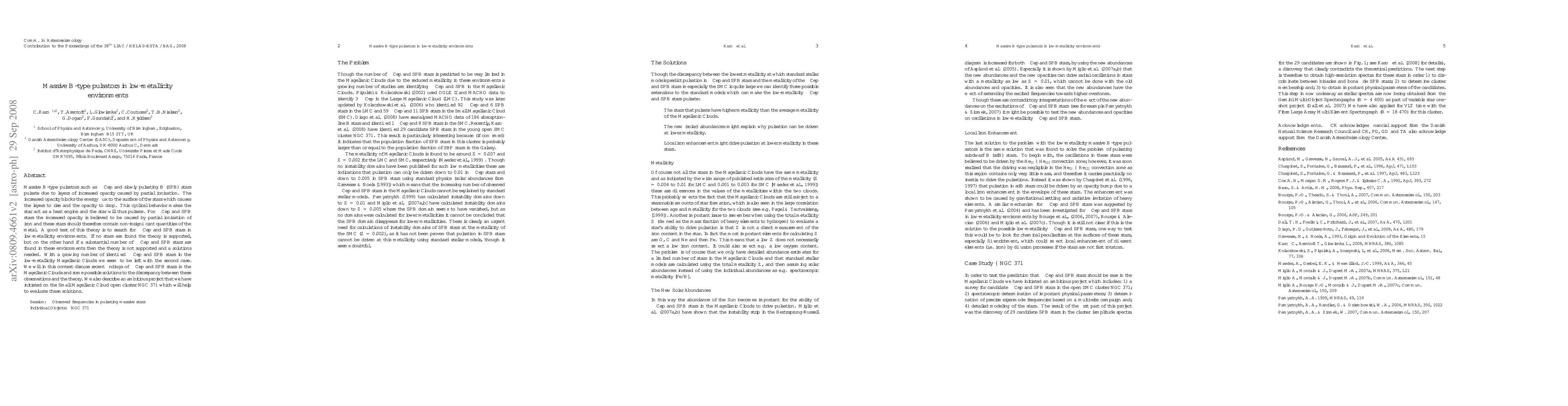 Massive B type pulsators such as beta Cep and slowly pulsating B (SPB) stars pulsate due to layers of increased opacity caused by partial ionization. The increased opacity blocks the energy flux to the surface of the stars which causes the layers to rise and the opacity to drop. This cyclical behavior makes the star act as a heat engine and the star will thus pulsate. For beta Cep and SPB stars the increased opacity is believed to be caused by partial ionization of iron and these stars should therefore contain non-insignificant quantities of the metal. A good test of this theory is to search for beta Cep and SPB stars in low-metallicity environments. If no stars are found the theory is supported, but on the other hand if a substantial number of beta Cep and SPB stars are found in these environments then the theory is not supported and a solutions needed. With a growing number of identified beta Cep and SPB stars in the low-metallicity Magellanic Clouds we seem to be left with the second case. We will in this context discuss recent findings of beta Cep and SPB stars in the Magellanic Clouds and some possible solutions to the discrepancy between these observations and the theory. We also describe an ambitious project that we have initiated on the Small Magellanic Cloud open cluster NGC 371 which will help to evaluate these solutions.