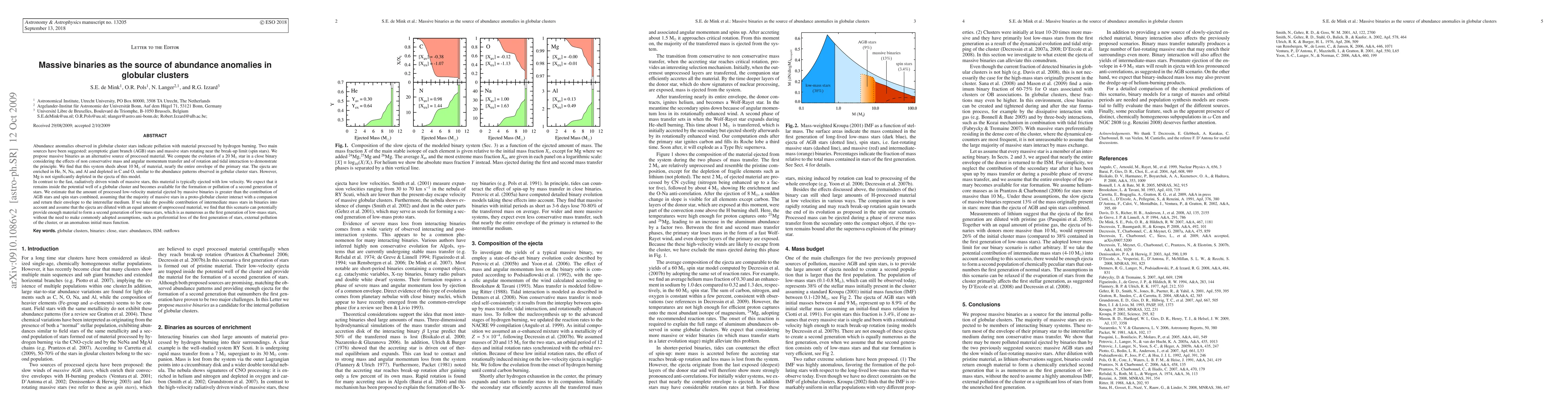 This paper proposes massive binaries as a significant source of abundance anomalies in globular cluster stars, suggesting that the material ejected by these systems can explain observed enrichment in elements like He, N, Na, and Al, and depletion in C and O, without requiring assumptions like external pollution or an anomalous initial mass function. The study finds that massive binaries eject processed material at low velocities, which remains within the cluster to potentially form a second generation of stars.