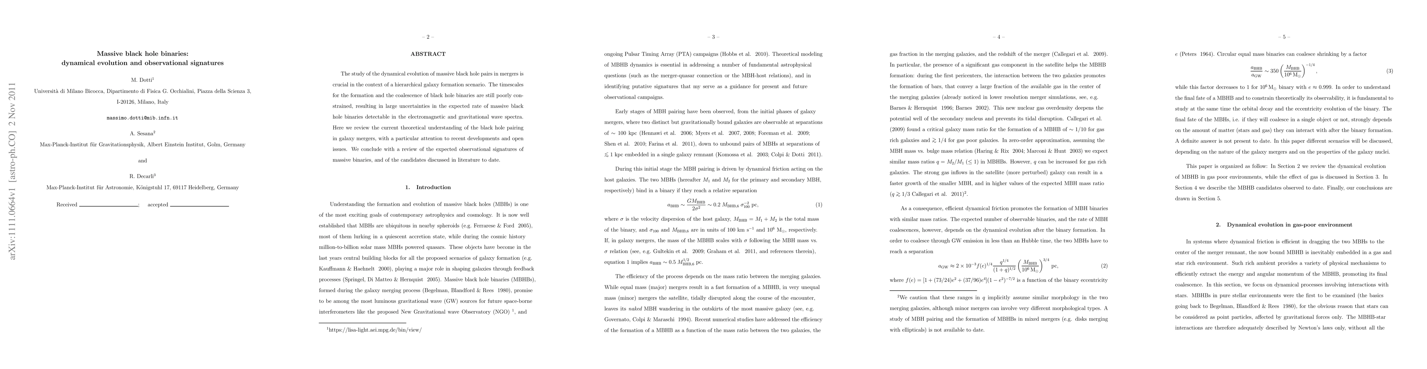 This paper reviews the theoretical dynamics of massive black hole binaries during galaxy mergers, highlighting uncertainties in their formation and coalescence timescales. It also examines the expected observational signatures and discusses current candidates in the literature.
