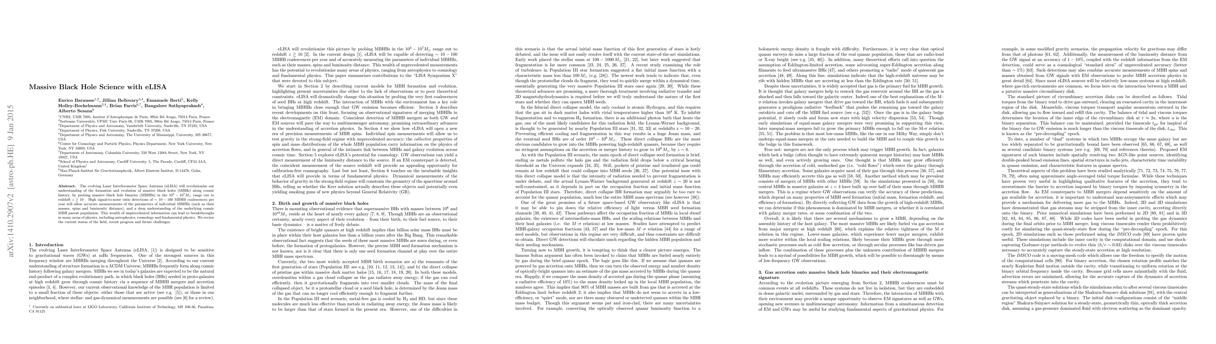 The evolving Laser Interferometer Space Antenna (eLISA) will revolutionize our understanding of the formation and evolution of massive black holes along cosmic history by probing massive black hole binaries in the $10^3-10^7$ solar mass range out to redshift $z\gtrsim 10$. High signal-to-noise ratio detections of $\sim 10-100$ binary coalescences per year will allow accurate measurements of the parameters of individual binaries (such as their masses, spins and luminosity distance), and a deep understanding of the underlying cosmic massive black hole parent population. This wealth of unprecedented information can lead to breakthroughs in many areas of physics, including astrophysics, cosmology and fundamental physics. We review the current status of the field, recent progress and future challenges.