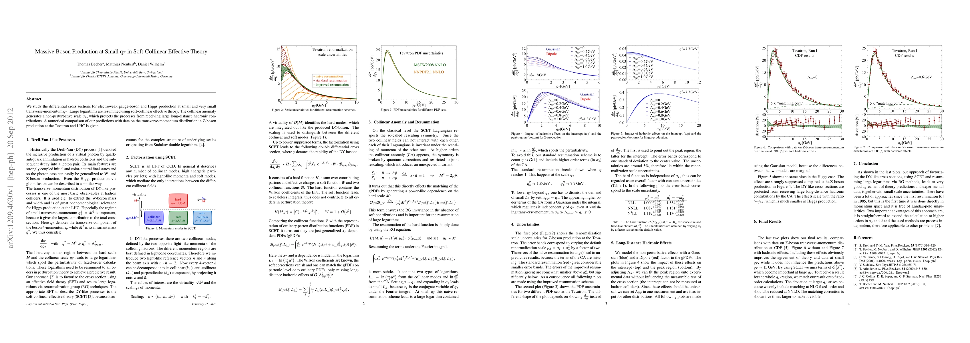 This paper investigates the differential cross sections for electroweak gauge-boson and Higgs production at low transverse momentum using soft-collinear effective theory, which resums large logarithms and introduces a non-perturbative scale to mitigate long-distance contributions. Numerical comparisons with experimental data on Z-boson production validate the theoretical predictions.