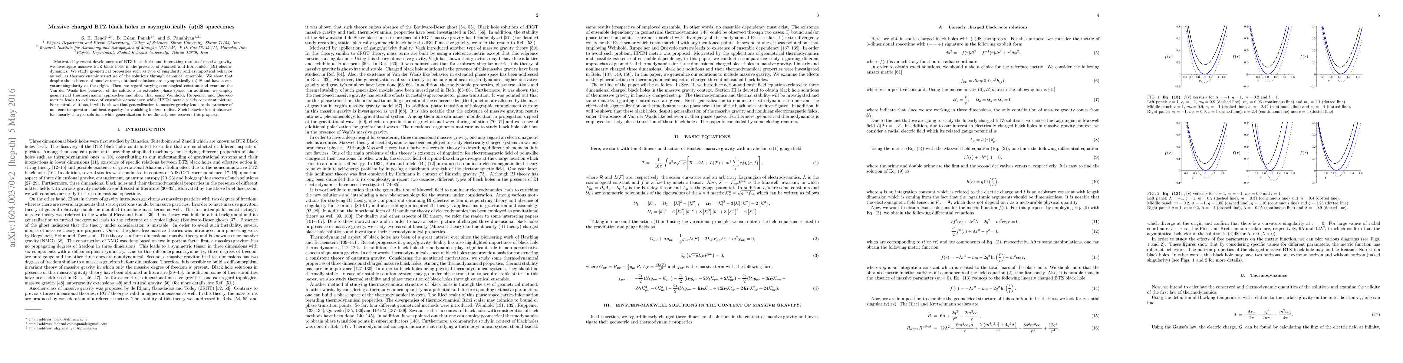 This paper explores massive charged BTZ black holes in asymptotically (anti-)de Sitter spacetimes, incorporating Maxwell and Born-Infeld electrodynamics. It examines the geometrical properties, thermodynamic structure, and the Van der Waals-like behavior in the extended phase space, revealing ensemble dependency in thermodynamic metrics.