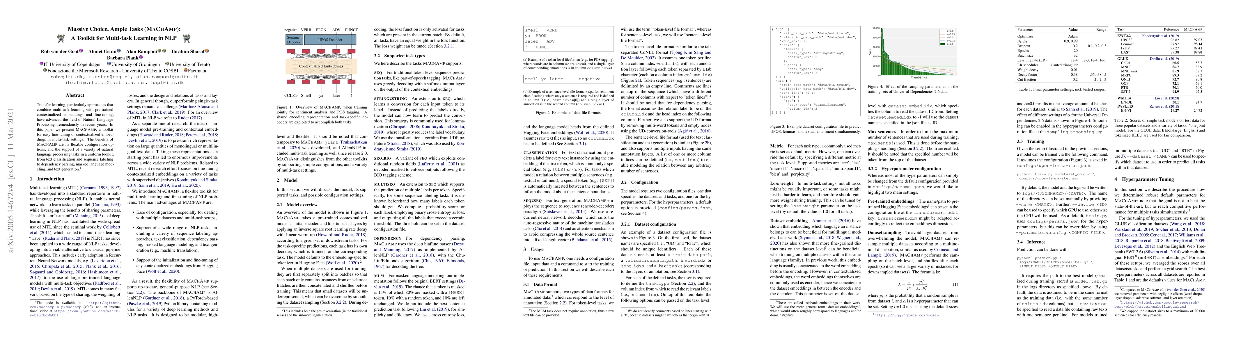 Transfer learning, particularly approaches that combine multi-task learning with pre-trained contextualized embeddings and fine-tuning, have advanced the field of Natural Language Processing tremendously in recent years. In this paper we present MaChAmp, a toolkit for easy fine-tuning of contextualized embeddings in multi-task settings. The benefits of MaChAmp are its flexible configuration options, and the support of a variety of natural language processing tasks in a uniform toolkit, from text classification and sequence labeling to dependency parsing, masked language modeling, and text generation.
