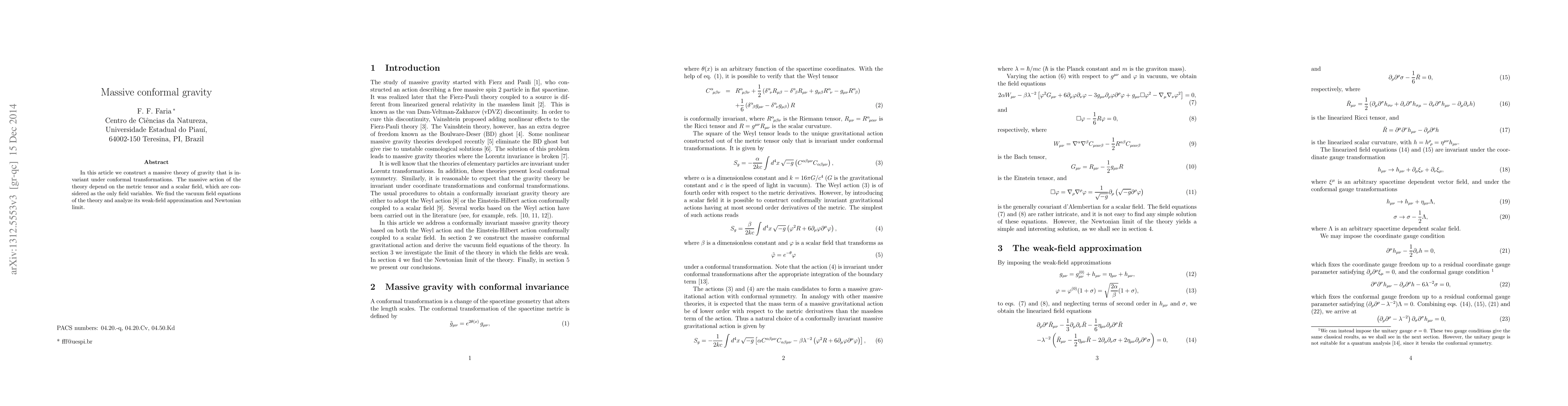 This paper constructs a massive conformal gravity theory invariant under conformal transformations, utilizing the metric tensor and a scalar field. It derives the vacuum field equations and explores the Newtonian limit of the proposed theory.