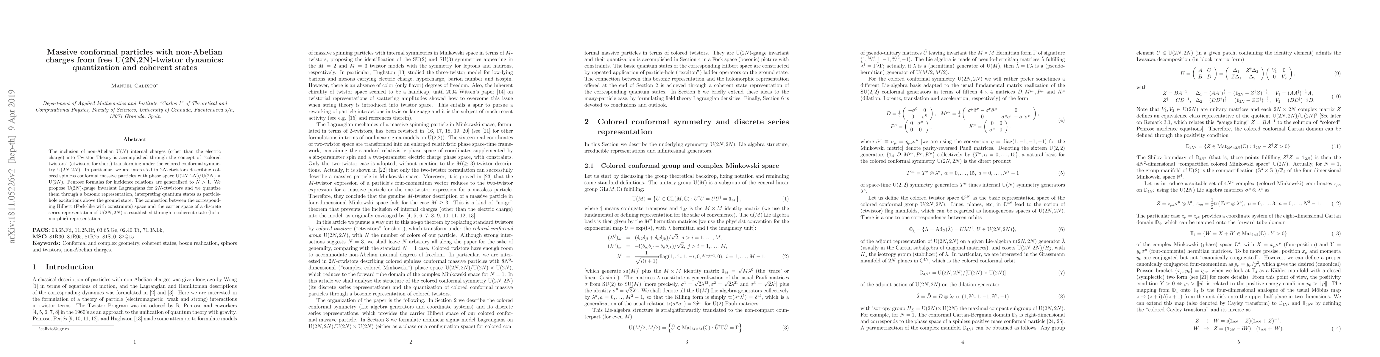 The inclusion of non-Abelian U(N) internal charges (other than the electric charge) into Twistor Theory is accomplished through the concept of "colored twistors" (ctwistors for short) transforming under the colored conformal symmetry U(2N,2N). In particular, we are interested in 2N-ctwistors describing colored spinless conformal massive particles with phase space U(2N,2N)/[U(2N)xU(2N)]. Penrose formulas for incidence relations are generalized to N>1. We propose U(2N)-gauge invariant Lagrangians for 2N-ctwistors and we quantize them through a bosonic representation, interpreting quantum states as particle-hole excitations above the ground state. The connection between the corresponding Hilbert (Fock-like with constraints) space and the carrier space of a discrete series representation of U(2N,2N) is established through a coherent space (holomorphic) representation.