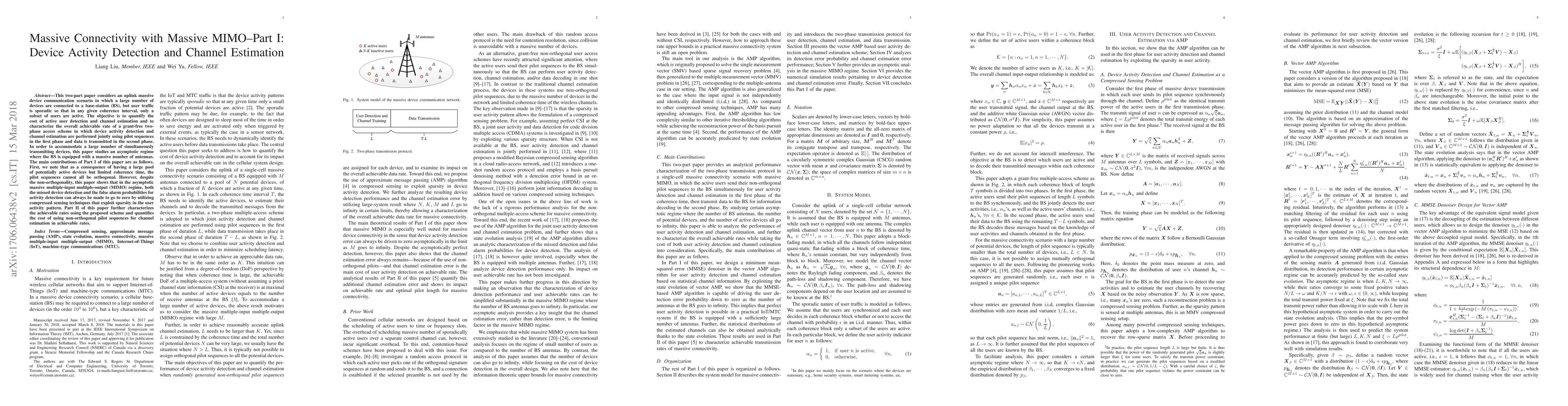 This two-part paper considers an uplink massive device communication scenario in which a large number of devices are connected to a base-station (BS), but user traffic is sporadic so that in any given coherence interval, only a subset of users are active. The objective is to quantify the cost of active user detection and channel estimation and to characterize the overall achievable rate of a grant-free two-phase access scheme in which device activity detection and channel estimation are performed jointly using pilot sequences in the first phase and data is transmitted in the second phase. In order to accommodate a large number of simultaneously transmitting devices, this paper studies an asymptotic regime where the BS is equipped with a massive number of antennas. The main contributions of Part I of this paper are as follows. First, we note that as a consequence of having a large pool of potentially active devices but limited coherence time, the pilot sequences cannot all be orthogonal. However, despite the non-orthogonality, this paper shows that in the asymptotic massive multiple-input multiple-output (MIMO) regime, both the missed device detection and the false alarm probabilities for activity detection can always be made to go to zero by utilizing compressed sensing techniques that exploit sparsity in the user activity pattern. Part II of this paper further characterizes the achievable rates using the proposed scheme and quantifies the cost of using non-orthogonal pilot sequences for channel estimation in achievable rates.