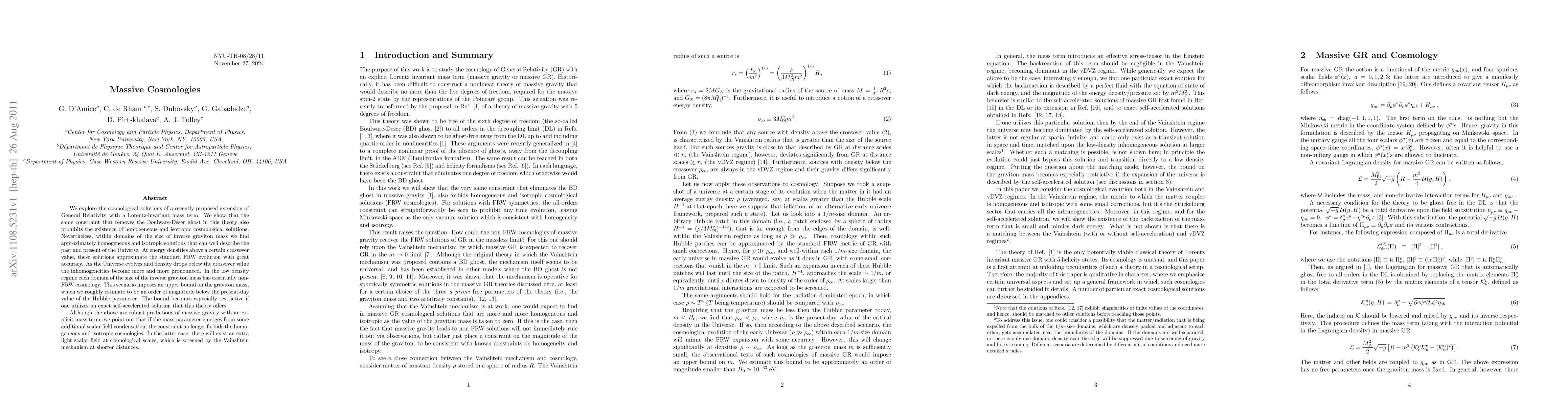 We explore the cosmological solutions of a recently proposed extension of General Relativity with a Lorentz-invariant mass term. We show that the same constraint that removes the Boulware-Deser ghost in this theory also prohibits the existence of homogeneous and isotropic cosmological solutions. Nevertheless, within domains of the size of inverse graviton mass we find approximately homogeneous and isotropic solutions that can well describe the past and present of the Universe. At energy densities above a certain crossover value, these solutions approximate the standard FRW evolution with great accuracy. As the Universe evolves and density drops below the crossover value the inhomogeneities become more and more pronounced. In the low density regime each domain of the size of the inverse graviton mass has essentially non-FRW cosmology. This scenario imposes an upper bound on the graviton mass, which we roughly estimate to be an order of magnitude below the present-day value of the Hubble parameter. The bound becomes especially restrictive if one utilizes an exact self-accelerated solution that this theory offers. Although the above are robust predictions of massive gravity with an explicit mass term, we point out that if the mass parameter emerges from some additional scalar field condensation, the constraint no longer forbids the homogeneous and isotropic cosmologies. In the latter case, there will exist an extra light scalar field at cosmological scales, which is screened by the Vainshtein mechanism at shorter distances.