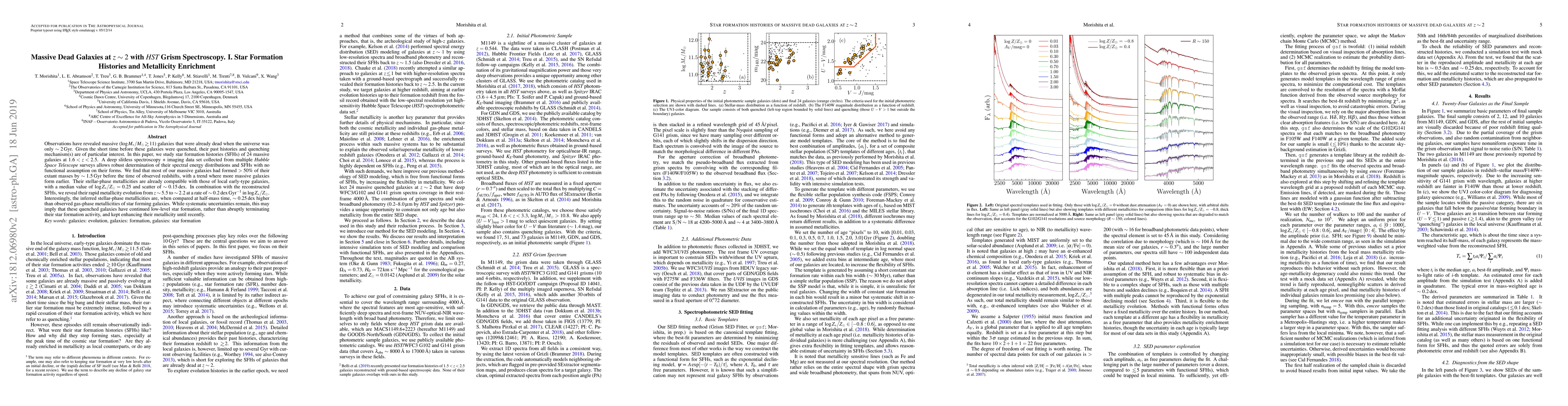This paper investigates the star formation histories and metallicity of massive dead galaxies at redshifts z~2 using HST grism spectroscopy. The study finds that these galaxies formed over 50% of their mass by 1.5 Gyr before observation, with rapid metallicity evolution, suggesting continued low-level star formation rather than abrupt cessation.