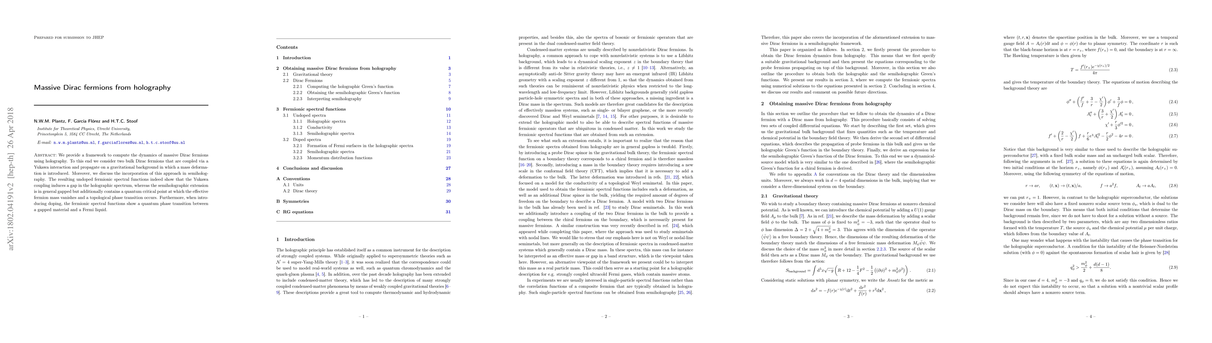 This paper develops a holographic framework to study massive Dirac fermions through a Yukawa interaction, revealing a gap in the undoped spectrum and a quantum phase transition upon doping. The semiholographic extension includes a quantum critical point and topological phase transition.