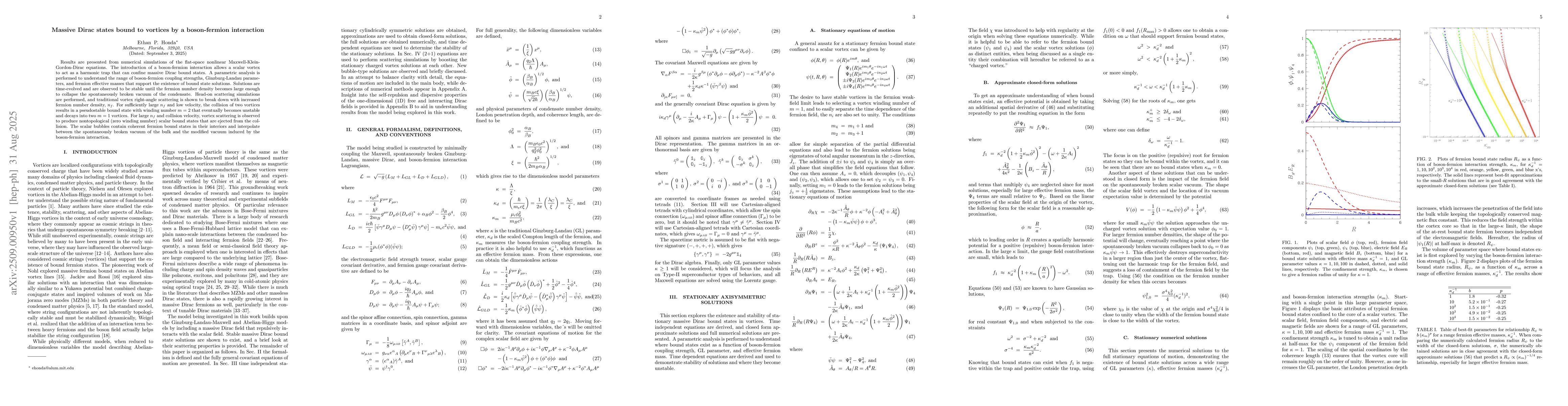 Results are presented from numerical simulations of the flat-space nonlinear Maxwell-Klein-Gordon-Dirac equations. The introduction of a boson-fermion interaction allows a scalar vortex to act as a harmonic trap that can confine massive Dirac bound states. A parametric analysis is performed to understand the range of boson-fermion coupling strengths, Ginzburg-Landau parameters, and fermion effective masses that support the existence of bound state solutions. Solutions are time-evolved and are observed to be stable until the fermion number density becomes large enough to collapse the spontaneously broken vacuum of the condensate. Head-on scattering simulations are performed, and traditional vortex right-angle scattering is shown to break down with increased fermion number density, $n_f$. For sufficiently large $n_f$ and low velocity, the collision of two vortices results in a pseudostable bound state with winding number $m=2$ that eventually becomes unstable and decays into two $m=1$ vortices. For large $n_f$ and collision velocity, vortex scattering is observed to produce nontopological (zero winding number) scalar bound states that are ejected from the collision. The scalar bubbles contain coherent fermion bound states in their interiors and interpolate between the spontaneously broken vacuum of the bulk and the modified vacuum induced by the boson-fermion interaction.