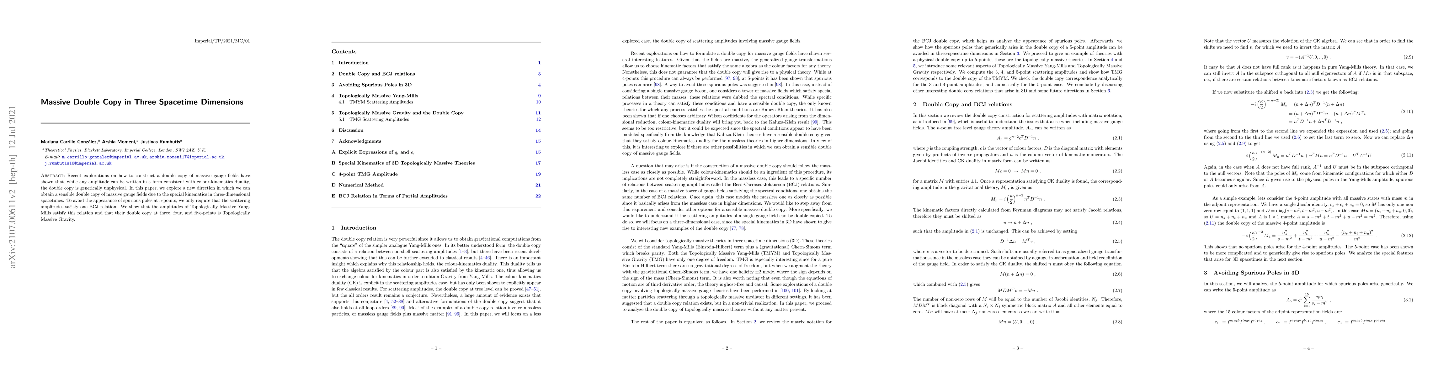 This paper explores constructing a physically viable double copy of massive gauge fields in three-dimensional spacetimes, demonstrating that the amplitudes of Topologically Massive Yang-Mills satisfy a single BCJ relation, leading to Topologically Massive Gravity as their double copy.