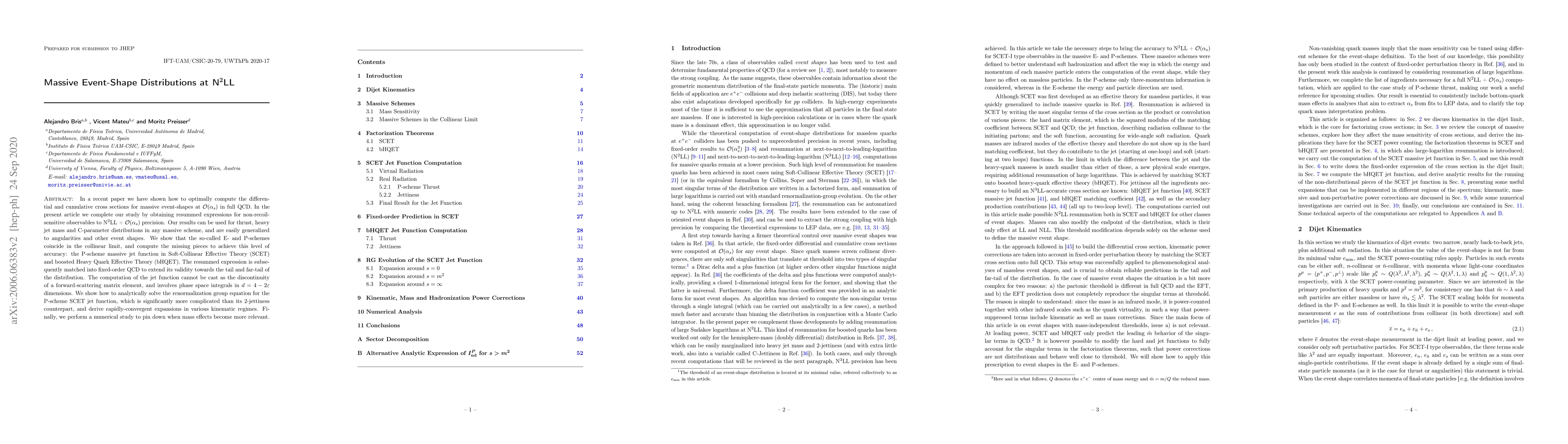 In a recent paper we have shown how to optimally compute the differential and cumulative cross sections for massive event-shapes at $\mathcal{O}(\alpha_s)$ in full QCD. In the present article we complete our study by obtaining resummed expressions for non-recoil-sensitive observables to N$^2$LL + $\mathcal{O}(\alpha_s)$ precision. Our results can be used for thrust, heavy jet mass and C-parameter distributions in any massive scheme, and are easily generalized to angularities and other event shapes. We show that the so-called E- and P-schemes coincide in the collinear limit, and compute the missing pieces to achieve this level of accuracy: the P-scheme massive jet function in Soft-Collinear Effective Theory (SCET) and boosted Heavy Quark Effective Theory (bHQET). The resummed expression is subsequently matched into fixed-order QCD to extend its validity towards the tail and far-tail of the distribution. The computation of the jet function cannot be cast as the discontinuity of a forward-scattering matrix element, and involves phase space integrals in $d=4-2\varepsilon$ dimensions. We show how to analytically solve the renormalization group equation for the P-scheme SCET jet function, which is significantly more complicated than its 2-jettiness counterpart, and derive rapidly-convergent expansions in various kinematic regimes. Finally, we perform a numerical study to pin down when mass effects become more relevant.