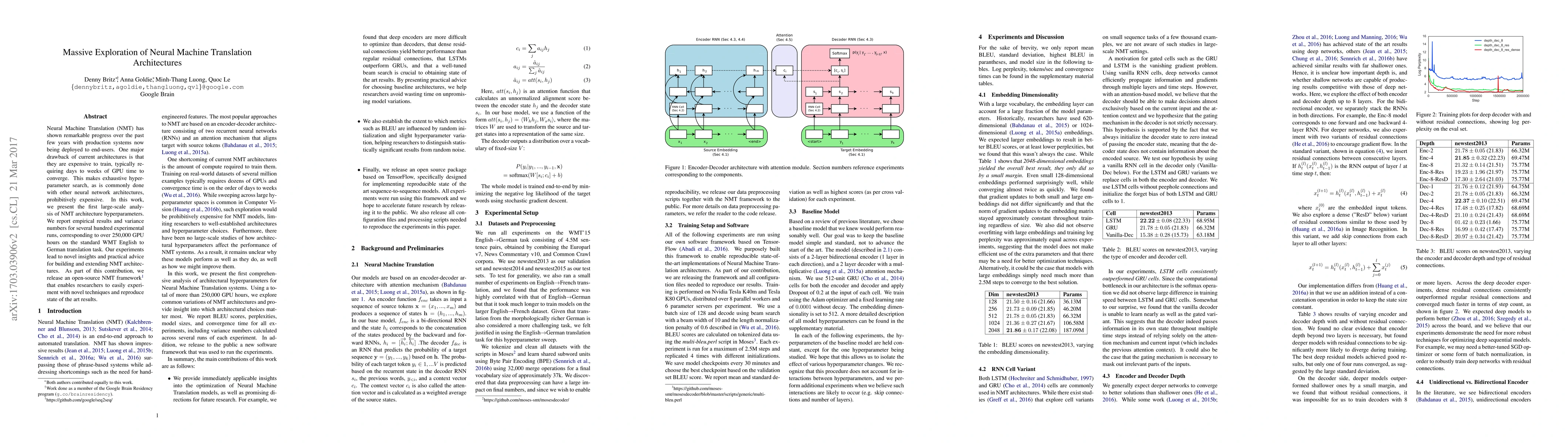 This paper conducts an extensive analysis of Neural Machine Translation (NMT) architectures, revealing insights from over 250,000 GPU hours of experiments. It provides practical advice for optimizing NMT models and releases an open-source framework to facilitate further research.