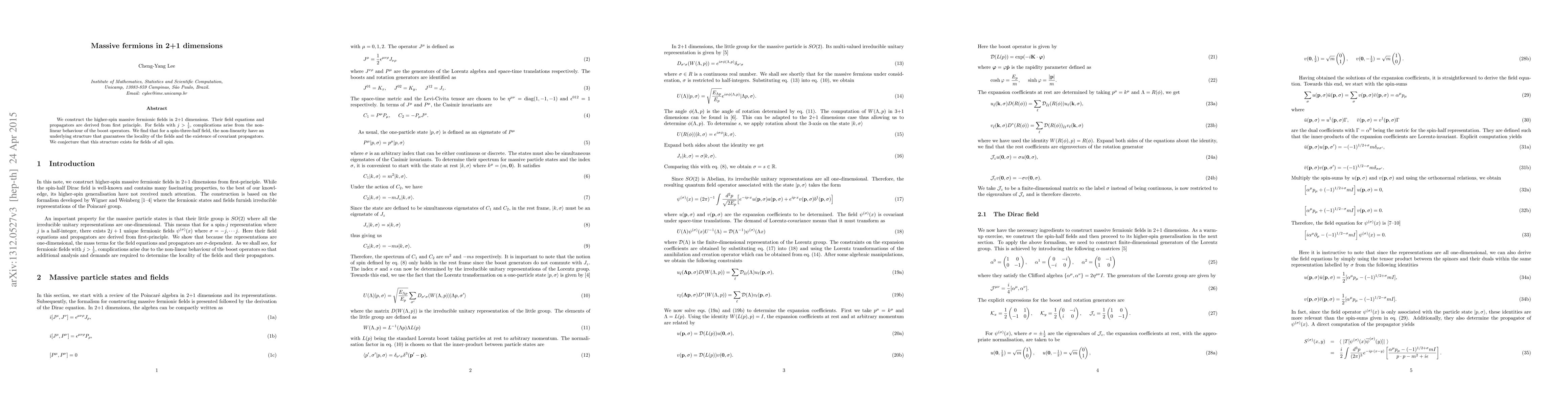 This paper constructs higher-spin massive fermionic fields in 2+1 dimensions, deriving their field equations and propagators. It addresses complications from non-linear boost operators for fields with spin greater than 1/2, finding a structure for spin-three-half fields that ensures locality and covariant propagators, with a conjecture that this structure applies to all spin fields.
