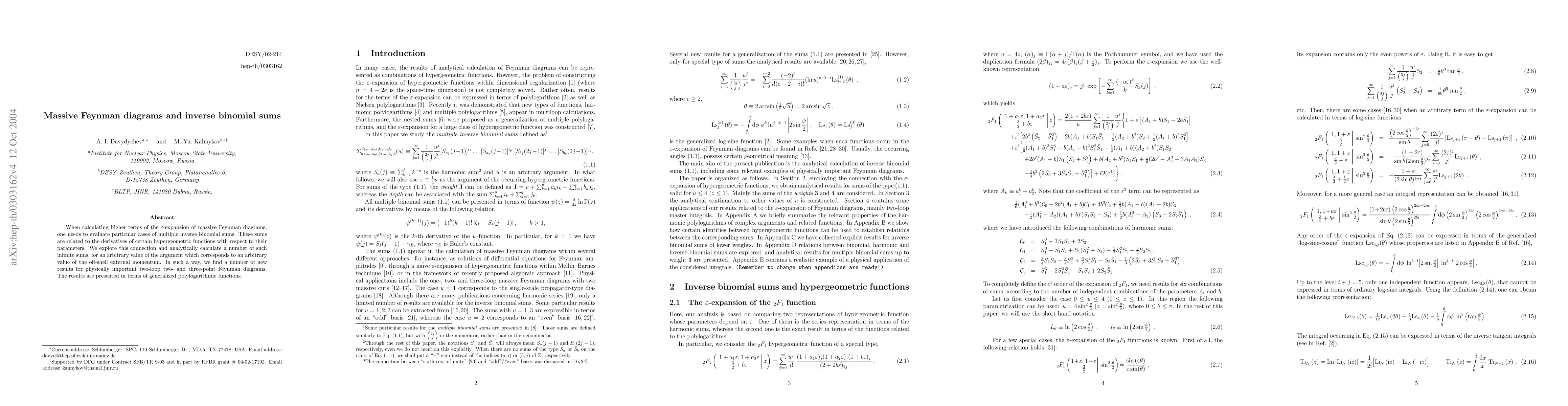 Researchers developed a new method to calculate higher-order terms in massive Feynman diagrams using inverse binomial sums and generating functions, leading to new results for physically important diagrams.