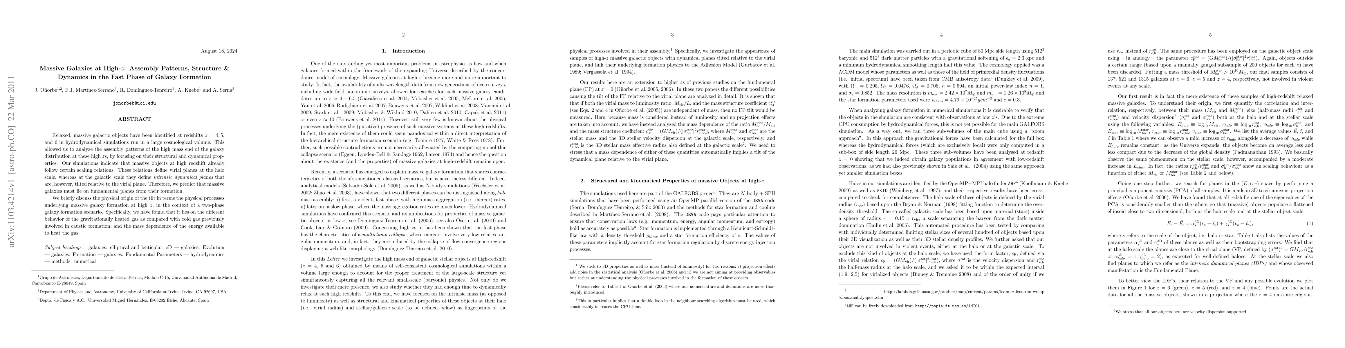 Relaxed, massive galactic objects have been identified at redshifts z = 4;5; and 6 in hydrodynamical simulations run in a large cosmological volume. This allowed us to analyze the assembly patterns of the high mass end of the galaxy distribution at these high zs, by focusing on their structural and dynamical properties. Our simulations indicate that massive objects at high redshift already follow certain scaling relations. These relations define virial planes at the halo scale, whereas at the galactic scale they define intrinsic dynamical planes that are, however, tilted relative to the virial plane. Therefore, we predict that massive galaxies must lie on fundamental planes from their formation. We briefly discuss the physical origin of the tilt in terms the physical processes underlying massive galaxy formation at high z, in the context of a two-phase galaxy formation scenario. Specifically, we have found that it lies on the different behavior of the gravitationally heated gas as compared with cold gas previously involved in caustic formation, and the mass dependence of the energy available to heat the gas.