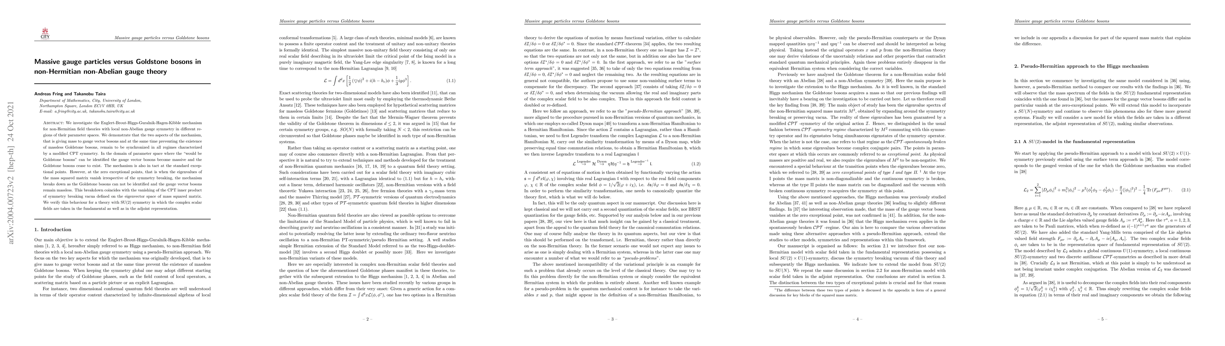 We investigate the Englert-Brout-Higgs-Guralnik-Hagen-Kibble mechanism for non-Hermitian field theories with local non-Abelian gauge symmetry in different regions of their parameter spaces. We demonstrate that the two aspects of the mechanism, that is giving mass to gauge vector bosons and at the same time preventing the existence of massless Goldstone bosons, remain to be synchronized in all regimes characterized by a modified CPT symmetry. In the domain of parameter space where the "would be Goldstone bosons" can be identified the gauge vector bosons become massive and the Goldstone bosons cease to exist. The mechanism is also in tact at the standard exceptional points. However, at the zero exceptional points, that is when the eigenvalues of the mass squared matrix vanish irrespective of the symmetry breaking, the mechanism breaks down as the Goldstone bosons can not be identified and the gauge vector bosons remain massless. This breakdown coincides with the vanishing of the CPT inner product of symmetry breaking vacua defined on the eigenvector space of mass squared matrix. We verify this behaviour for a theory with SU(N) symmetry in which the complex scalar fields are taken in the fundamental as well as in the adjoint representation.