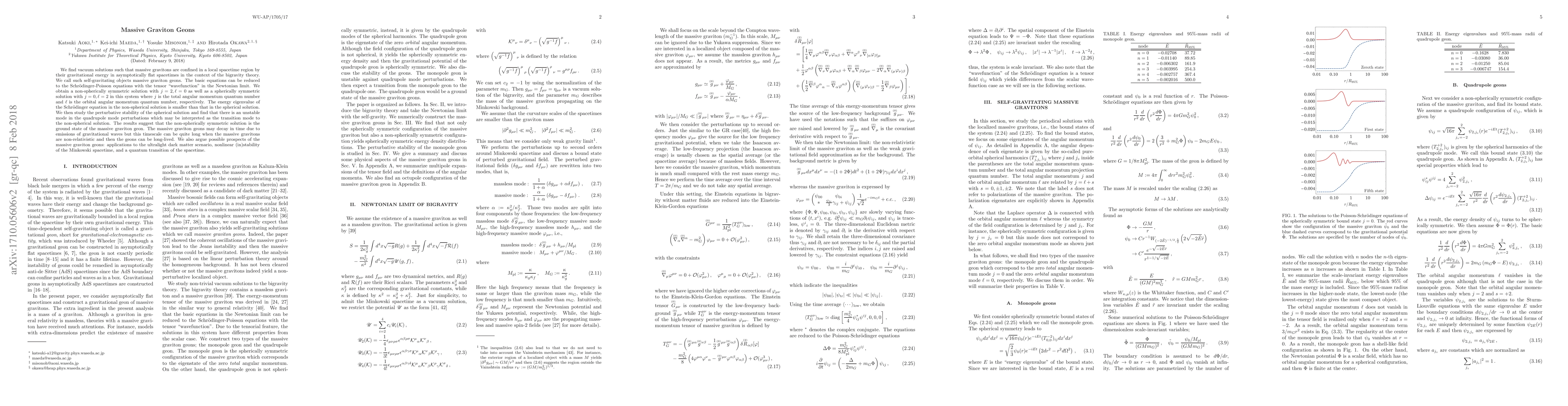 We find vacuum solutions such that massive gravitons are confined in a local spacetime region by their gravitational energy in asymptotically flat spacetimes in the context of the bigravity theory. We call such self-gravitating objects massive graviton geons. The basic equations can be reduced to the Schr\"odinger-Poisson equations with the tensor "wavefunction" in the Newtonian limit. We obtain a non-spherically symmetric solution with $j=2,\ell=0$ as well as a spherically symmetric solution with $j=0,\ell=2$ in this system where $j$ is the total angular momentum quantum number and $\ell$ is the orbital angular momentum quantum number, respectively. The energy eigenvalue of the Schr\"odinger equation in the non-spherical solution is smaller than that in the spherical solution. We then study the perturbative stability of the spherical solution and find that there is an unstable mode in the quadrupole mode perturbations which may be interpreted as the transition mode to the non-spherical solution. The results suggest that the non-spherically symmetric solution is the ground state of the massive graviton geon. The massive graviton geons may decay in time due to emissions of gravitational waves but this timescale can be quite long when the massive gravitons are non-relativistic and then the geons can be long-lived. We also argue possible prospects of the massive graviton geons: applications to the ultralight dark matter scenario, nonlinear (in)stability of the Minkowski spacetime, and a quantum transition of the spacetime.