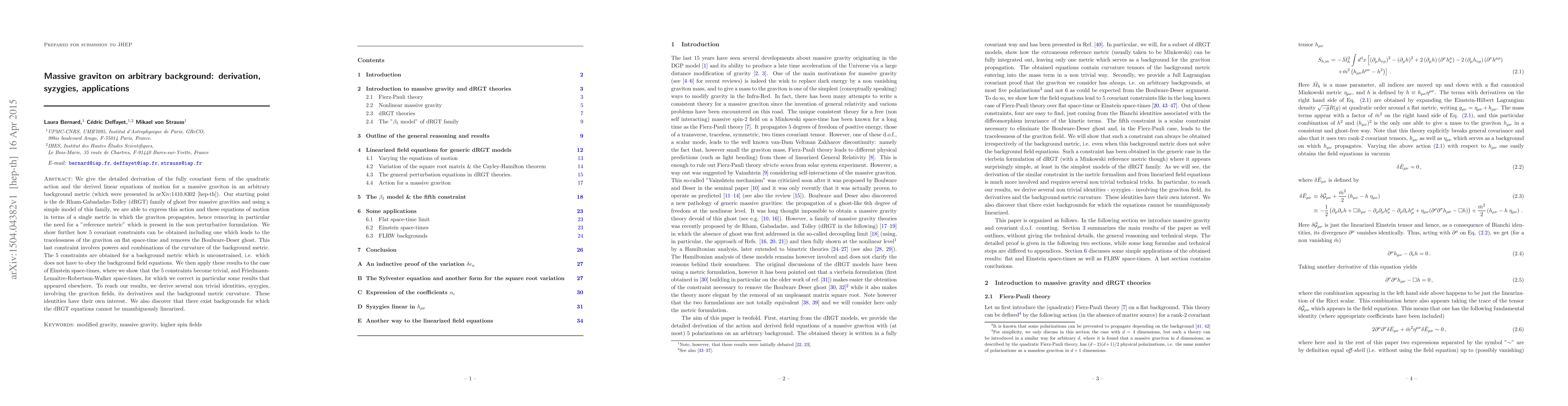 We give the detailed derivation of the fully covariant form of the quadratic action and the derived linear equations of motion for a massive graviton in an arbitrary background metric (which were presented in arXiv:1410.8302 [hep-th]). Our starting point is the de Rham-Gabadadze-Tolley (dRGT) family of ghost free massive gravities and using a simple model of this family, we are able to express this action and these equations of motion in terms of a single metric in which the graviton propagates, hence removing in particular the need for a "reference metric" which is present in the non perturbative formulation. We show further how 5 covariant constraints can be obtained including one which leads to the tracelessness of the graviton on flat space-time and removes the Boulware-Deser ghost. This last constraint involves powers and combinations of the curvature of the background metric. The 5 constraints are obtained for a background metric which is unconstrained, i.e. which does not have to obey the background field equations. We then apply these results to the case of Einstein space-times, where we show that the 5 constraints become trivial, and Friedmann-Lema\^{\i}tre-Robertson-Walker space-times, for which we correct in particular some results that appeared elsewhere. To reach our results, we derive several non trivial identities, syzygies, involving the graviton fields, its derivatives and the background metric curvature. These identities have their own interest. We also discover that there exist backgrounds for which the dRGT equations cannot be unambiguously linearized.