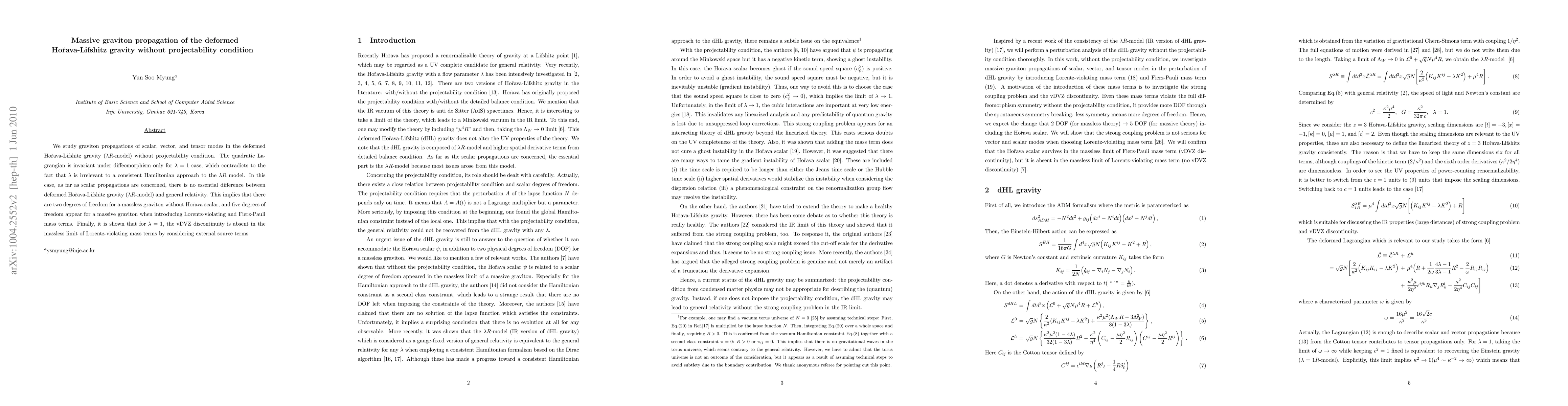 We study graviton propagations of scalar, vector, and tensor modes in the deformed Ho\v{r}ava-Lifshitz gravity ($\lambda R$-model) without projectability condition. The quadratic Lagrangian is invariant under diffeomorphism only for $\lambda=1$ case, which contradicts to the fact that $\lambda$ is irrelevant to a consistent Hamiltonian approach to the $\lambda R$ model. In this case, as far as scalar propagations are concerned, there is no essential difference between deformed Ho\v{r}ava-Lifshitz gravity ($\lambda R$-model) and general relativity. This implies that there are two degrees of freedom for a massless graviton without Ho\v{r}ava scalar, and five degrees of freedom appear for a massive graviton when introducing Lorentz-violating and Fierz-Pauli mass terms. Finally, it is shown that for $\lambda=1$, the vDVZ discontinuity is absent in the massless limit of Lorentz-violating mass terms by considering external source terms.