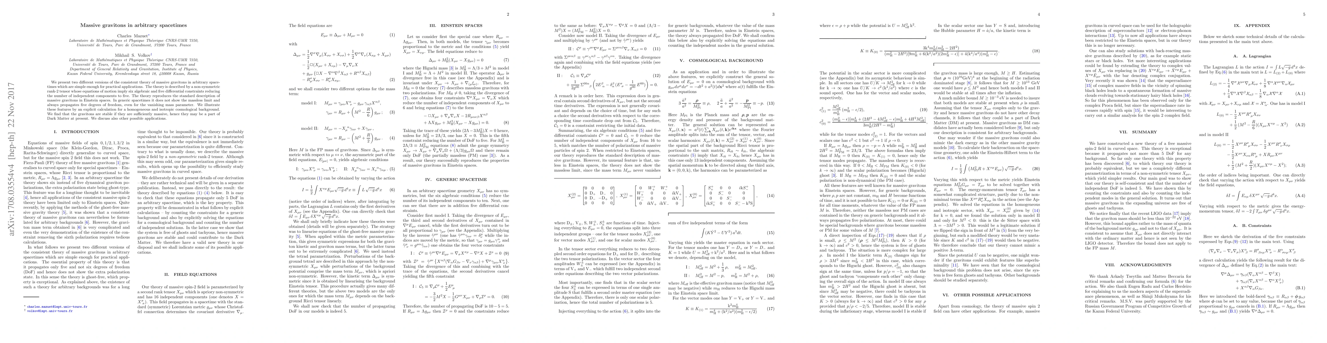 We present two different versions of the consistent theory of massive gravitons in arbitrary spacetimes which are simple enough for practical applications. The theory is described by a non-symmetric rank-2 tensor whose equations of motion imply six algebraic and five differential constraints reducing the number of independent components to five. The theory reproduces the standard description of massive gravitons in Einstein spaces. In generic spacetimes it does not show the massless limit and always propagates five degrees of freedom, even for the vanishing mass parameter. We illustrate these features by an explicit calculation for a homogeneous and isotropic cosmological background. We find that the gravitons are stable if they are sufficiently massive, hence they may be a part of Dark Matter at present. We discuss also other possible applications.