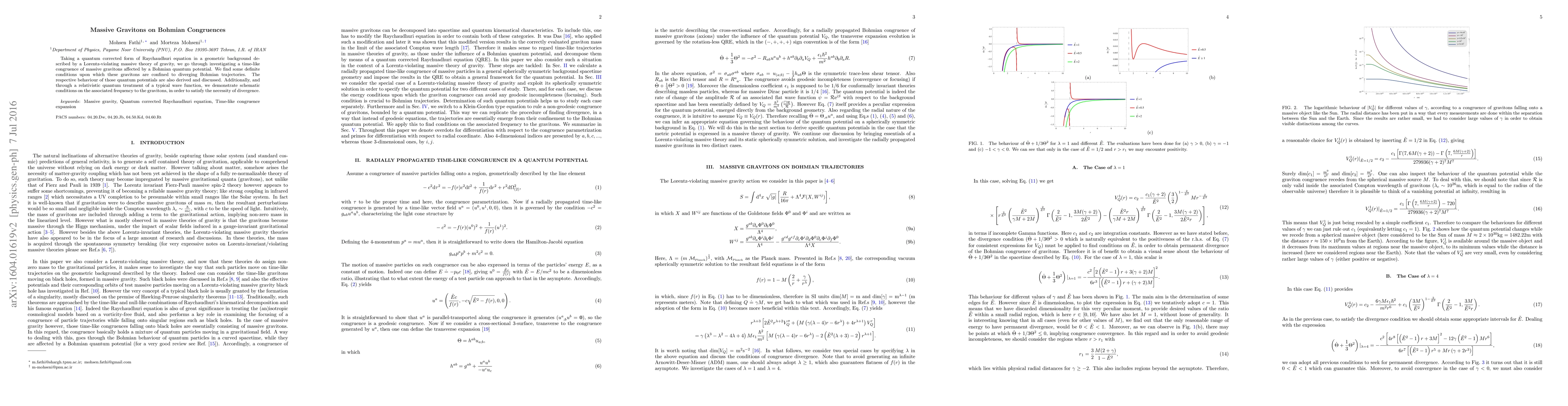 Taking a quantum corrected form of Raychaudhuri equation in a geometric background described by a Lorentz-violating massive theory of gravity, we go through investigating a time-like congruence of massive gravitons affected by a Bohmian quantum potential. We find some definite conditions upon which these gravitons are confined to diverging Bohmian trajectories. The respective behaviour of those quantum potentials are also derived and discussed. Additionally, and through a relativistic quantum treatment of a typical wave function, we demonstrate schematic conditions on the associated frequency to the gravitons, in order to satisfy the necessity of divergence.
