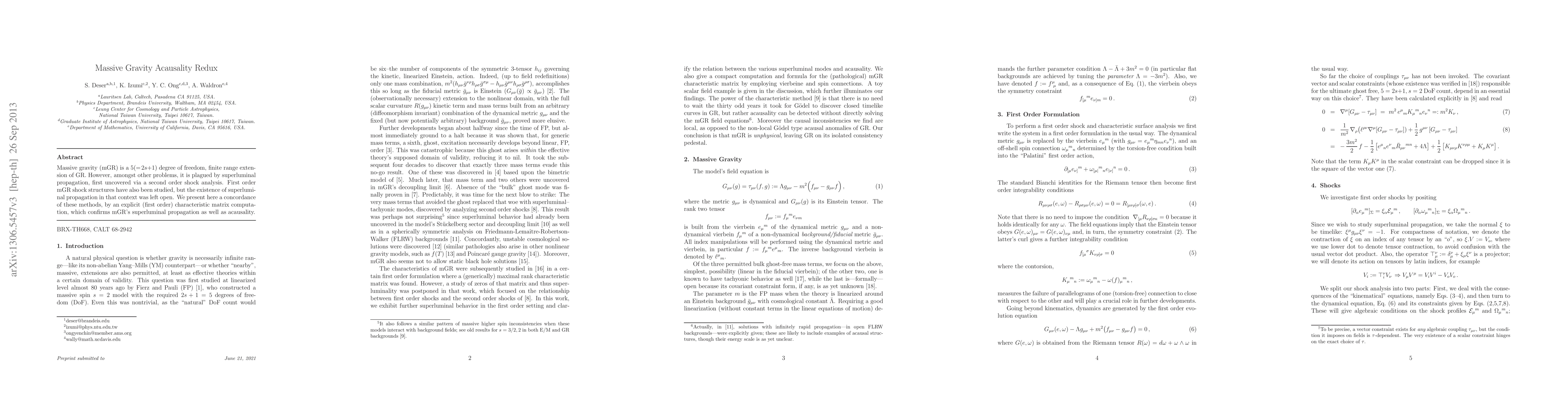 Massive gravity (mGR) is a 5(=2s+1) degree of freedom, finite range extension of GR. However, amongst other problems, it is plagued by superluminal propagation, first uncovered via a second order shock analysis. First order mGR shock structures have also been studied, but the existence of superluminal propagation in that context was left open. We present here a concordance of these methods, by an explicit (first order) characteristic matrix computation, which confirms mGR's superluminal propagation as well as acausality.