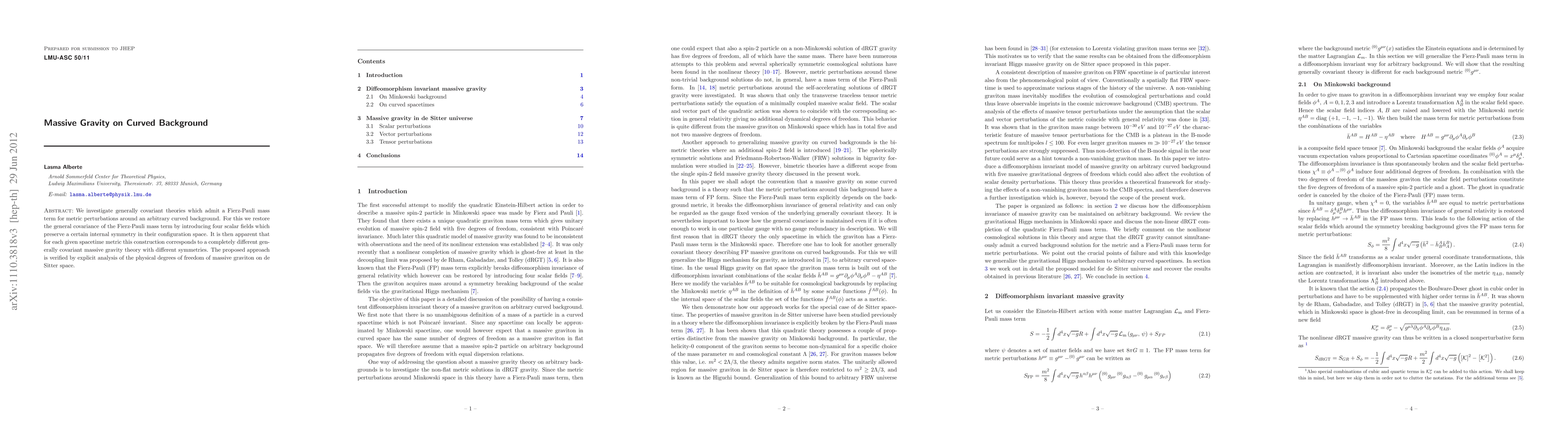 We investigate generally covariant theories which admit a Fierz-Pauli mass term for metric perturbations around an arbitrary curved background. For this we restore the general covariance of the Fierz-Pauli mass term by introducing four scalar fields which preserve a certain internal symmetry in their configuration space. It is then apparent that for each given spacetime metric this construction corresponds to a completely different generally covariant massive gravity theory with different symmetries. The proposed approach is verified by explicit analysis of the physical degrees of freedom of massive graviton on de Sitter space.