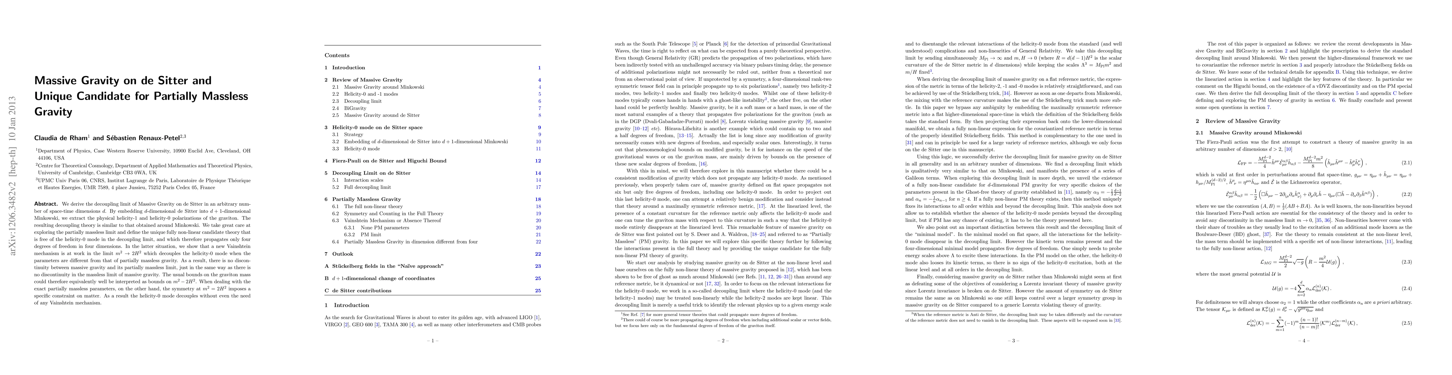 We derive the decoupling limit of Massive Gravity on de Sitter in an arbitrary number of space-time dimensions d. By embedding d-dimensional de Sitter into d+1-dimensional Minkowski, we extract the physical helicity-1 and helicity-0 polarizations of the graviton. The resulting decoupling theory is similar to that obtained around Minkowski. We take great care at exploring the partially massless limit and define the unique fully non-linear candidate theory that is free of the helicity-0 mode in the decoupling limit, and which therefore propagates only four degrees of freedom in four dimensions. In the latter situation, we show that a new Vainshtein mechanism is at work in the limit m^2\to 2 H^2 which decouples the helicity-0 mode when the parameters are different from that of partially massless gravity. As a result, there is no discontinuity between massive gravity and its partially massless limit, just in the same way as there is no discontinuity in the massless limit of massive gravity. The usual bounds on the graviton mass could therefore equivalently well be interpreted as bounds on m^2-2H^2. When dealing with the exact partially massless parameters, on the other hand, the symmetry at m^2=2H^2 imposes a specific constraint on matter. As a result the helicity-0 mode decouples without even the need of any Vainshtein mechanism.