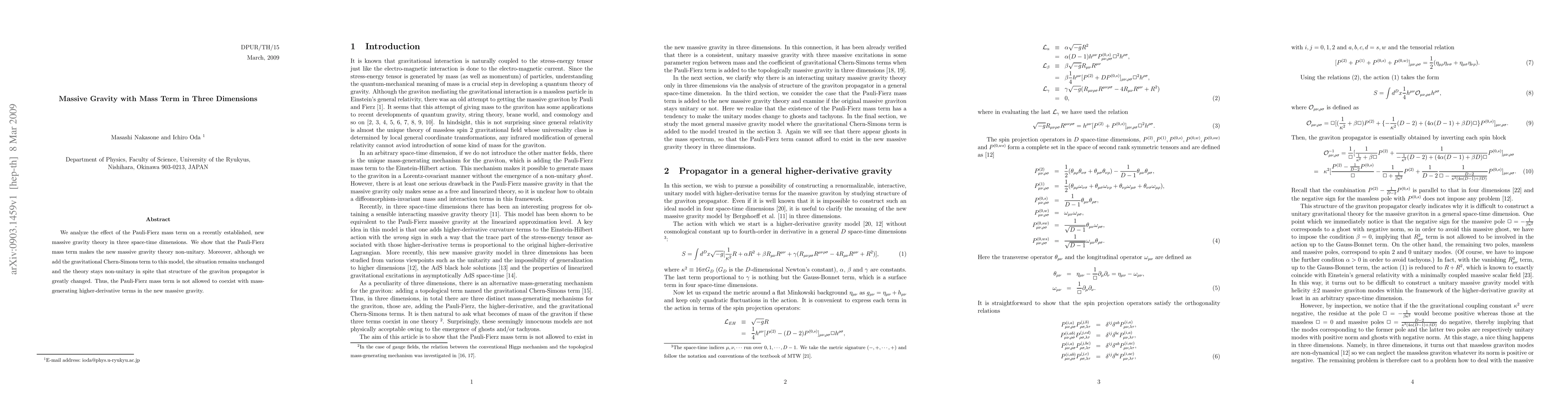 This paper investigates the Pauli-Fierz mass term's impact on a new massive gravity theory in three dimensions, finding that it renders the theory non-unitary. Adding the gravitational Chern-Simons term does not rectify this issue, indicating the incompatibility of the mass term with higher-derivative mass-generating terms.