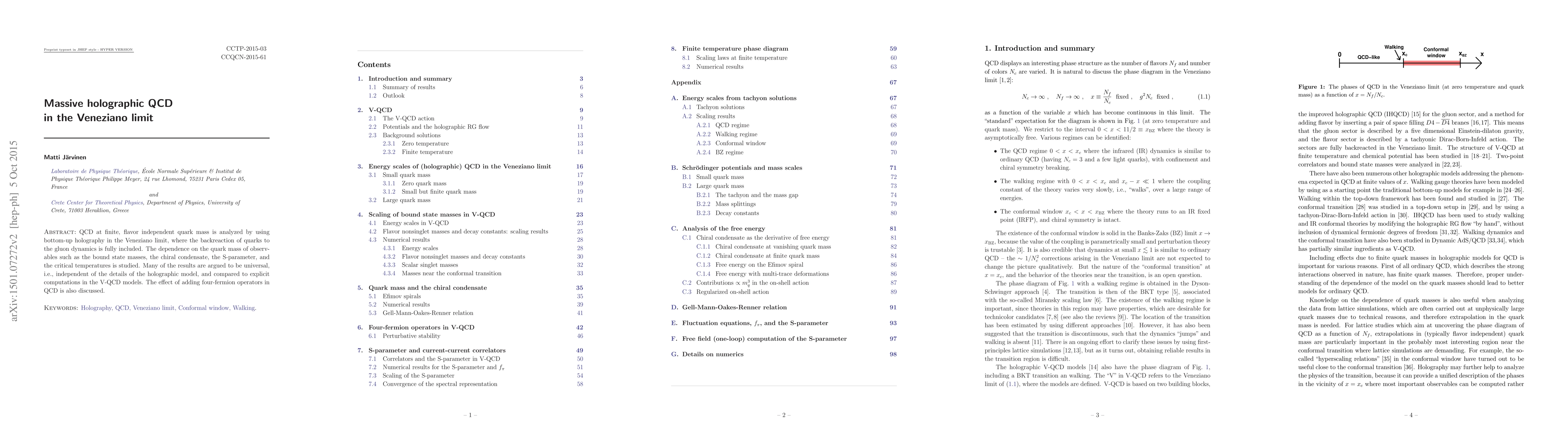 This study utilizes bottom-up holography in the Veneziano limit to analyze finite-mass QCD, focusing on quark mass dependencies of various observables, arguing for universal results across different holographic models and comparing to V-QCD models. It also explores the impact of four-fermion operators in QCD.