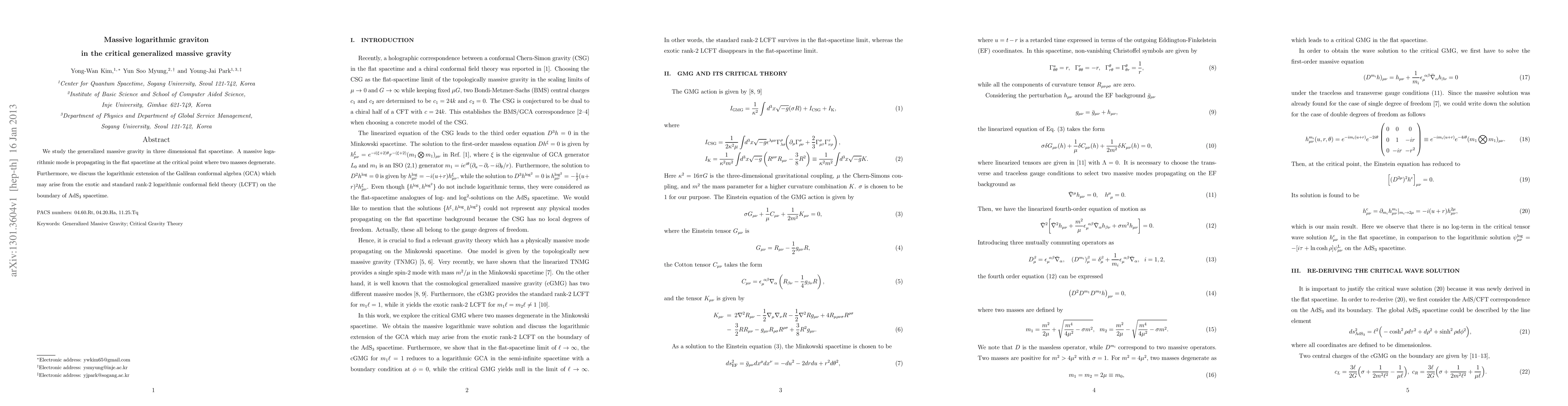 This paper explores generalized massive gravity in three-dimensional flat spacetime, identifying a massive logarithmic graviton mode at the critical mass degeneracy point. It also examines the logarithmic extension of the Galilean conformal algebra potentially emerging from rank-2 logarithmic conformal field theories on the boundary of AdS3 spacetime.