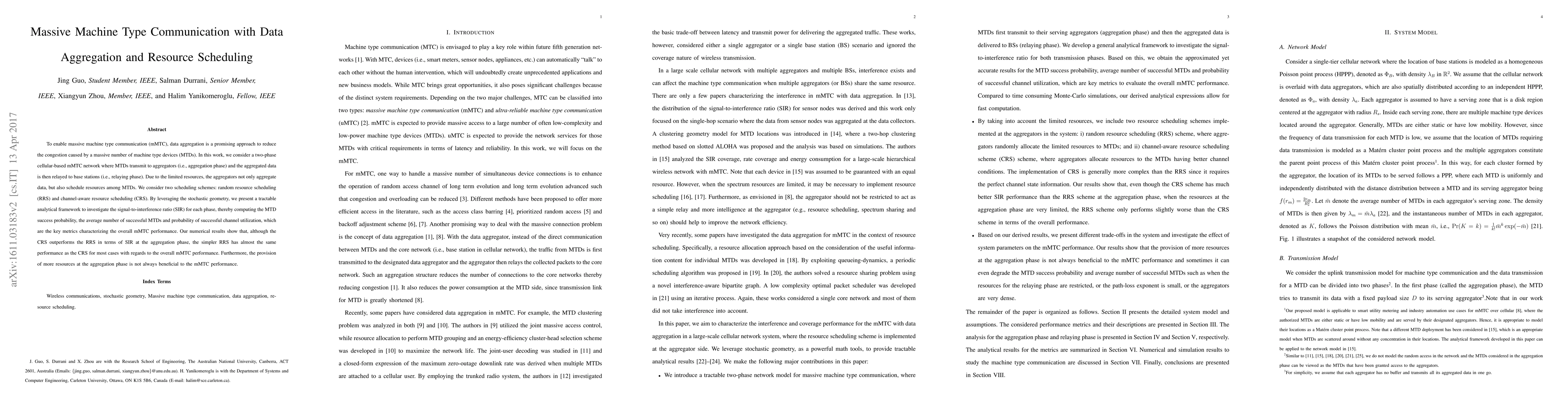 This paper investigates data aggregation and resource scheduling in massive machine type communication networks, comparing random and channel-aware scheduling schemes. Analytical results show that while channel-aware scheduling improves signal-to-interference ratio, random scheduling is simpler and nearly as effective for overall performance, with additional resources not always enhancing mMTC performance.