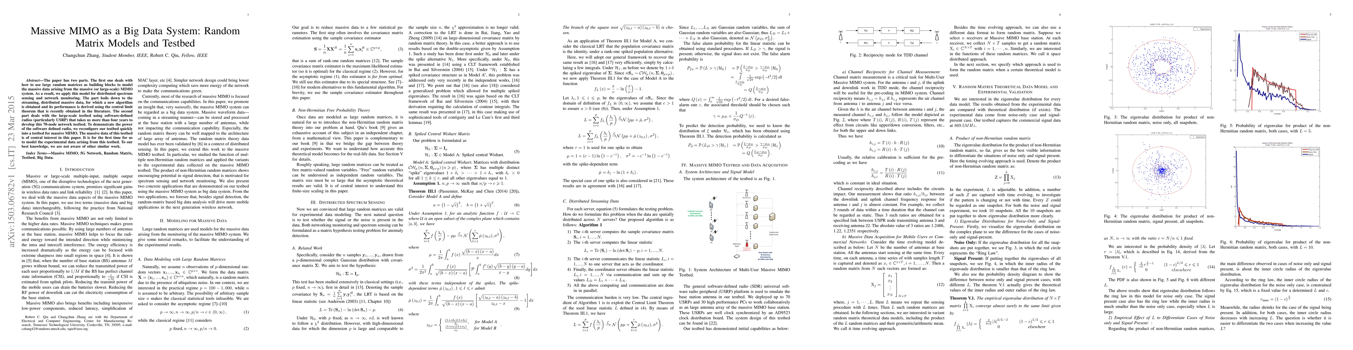The paper has two parts. The first one deals with how to use large random matrices as building blocks to model the massive data arising from the massive (or large-scale) MIMO system. As a result, we apply this model for distributed spectrum sensing and network monitoring. The part boils down to the streaming, distributed massive data, for which a new algorithm is obtained and its performance is derived using the central limit theorem that is recently obtained in the literature. The second part deals with the large-scale testbed using software-defined radios (particularly USRP) that takes us more than four years to develop this 70-node network testbed. To demonstrate the power of the software defined radio, we reconfigure our testbed quickly into a testbed for massive MIMO. The massive data of this testbed is of central interest in this paper. It is for the first time for us to model the experimental data arising from this testbed. To our best knowledge, we are not aware of other similar work.