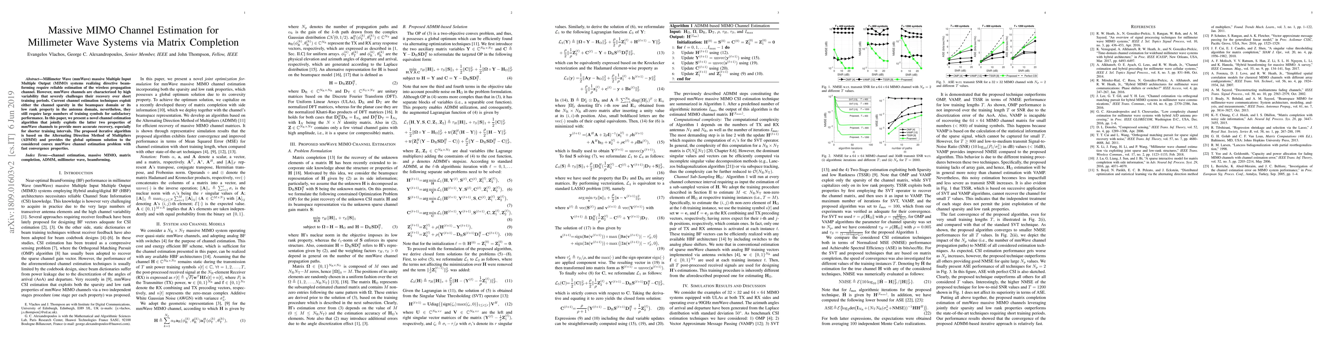 Millimeter Wave (mmWave) massive Multiple Input Multiple Output (MIMO) systems realizing directive beamforming require reliable estimation of the wireless propagation channel. However, mmWave channels are characterized by high variability that severely challenges their recovery over short training periods. Current channel estimation techniques exploit either the channel sparsity in the beamspace domain or its low rank property in the antenna domain, nevertheless, they still require large numbers of training symbols for satisfactory performance. In this paper, we present a novel channel estimation algorithm that jointly exploits the latter two properties of mmWave channels to provide more accurate recovery, especially for shorter training intervals. The proposed iterative algorithm is based on the Alternating Direction Method of Multipliers (ADMM) and provides the global optimum solution to the considered convex mmWave channel estimation problem with fast convergence properties.