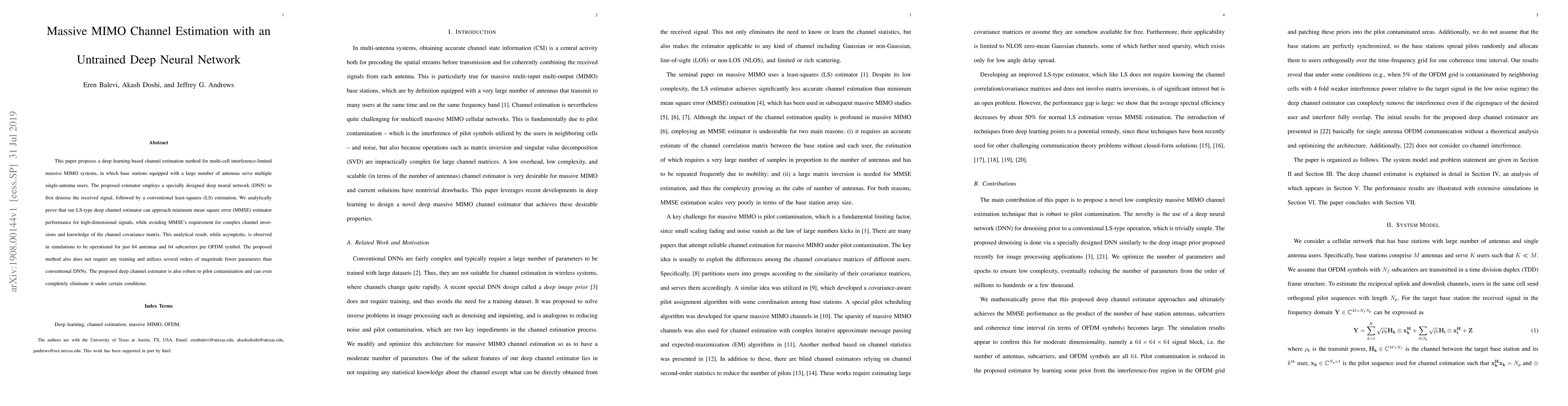 This paper introduces a deep learning-based channel estimation method for massive MIMO systems that uses a specially designed untrained deep neural network to denoise signals and perform least-squares estimation, achieving near-optimal performance without requiring training or complex channel inversions. The method is robust to pilot contamination and is effective even with a relatively small number of antennas and subcarriers.