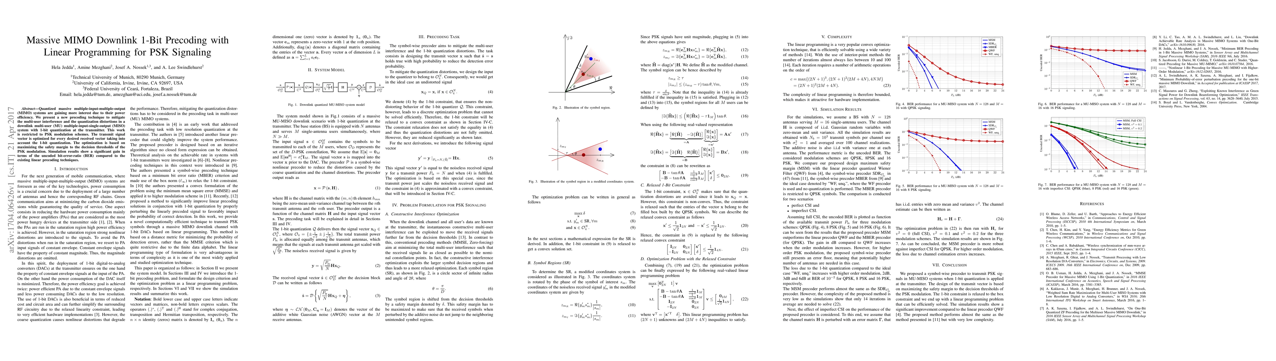 This paper proposes a novel precoding technique for quantized massive MIMO downlink systems using 1-bit quantization and linear programming, specifically for PSK modulation. The method optimizes the transmit signal to maximize the safety margin for PSK decision thresholds, achieving a significant improvement in uncoded bit-error-ratio (BER) compared to existing linear precoding methods.