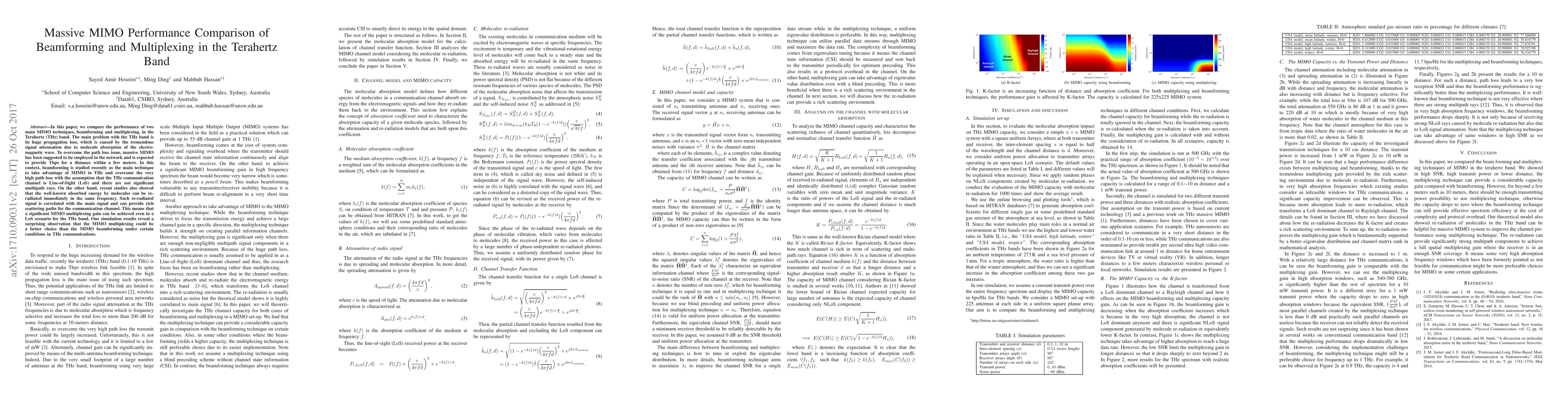 In this paper, we compare the performance of two main MIMO techniques, beamforming and multiplexing, in the Terahertz (THz) band. The main problem with the THz band is its huge propagation loss, which is caused by the tremendous signal attenuation due to molecule absorption of the electro-magnetic wave. To overcome the path loss issue, massive MIMO has been suggested to be employed in the network and is expected to provide Tbps for a distance within a few meters. In this context, beamforming is studied recently as the main technique to take advantage of MIMO in THz and overcome the very high path loss with the assumption that the THz communication channel is Line-of-Sight (LoS) and there are not significant multipath rays. On the other hand, recent studies also showed that the well-known absorbed energy by molecules can be re-radiated immediately in the same frequency. Such re-radiated signal is correlated with the main signal and can provide rich scattering paths for the communication channel. This means that a significant MIMO multiplexing gain can be achieved even in a LoS scenario for the THz band. Our simulation results reveal a surprising observation that the MIMO multiplexing could be a better choice than the MIMO beamforming under certain conditions in THz communications.