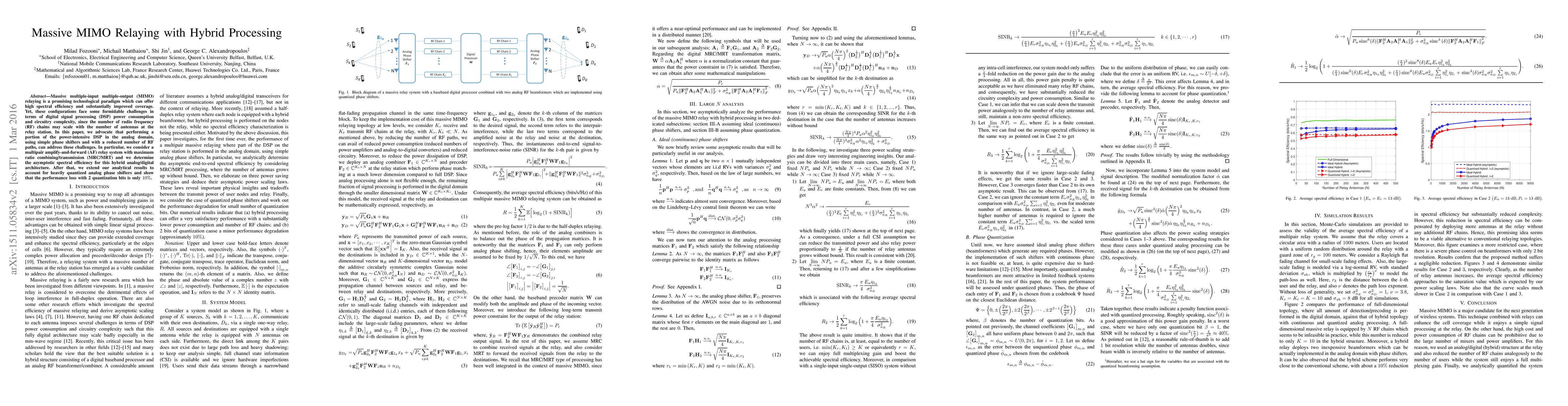 This paper explores massive MIMO relaying with hybrid analog/digital processing to tackle DSP power consumption and circuitry complexity. It proposes using analog phase shifters for part of the signal processing, demonstrating that this approach maintains 90% of the spectral efficiency despite quantization losses.