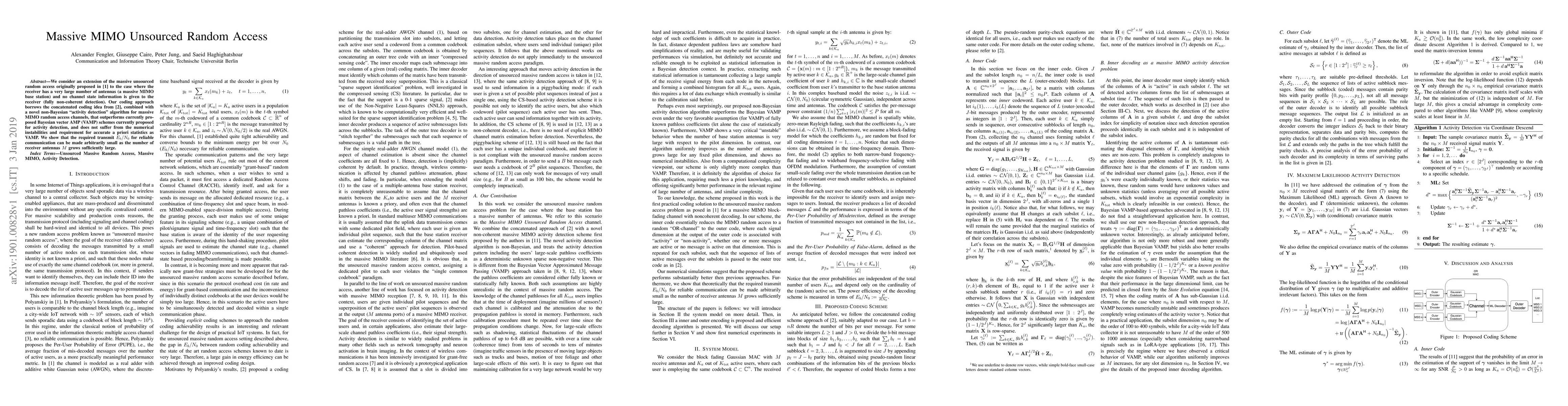 We consider an extension of the massive unsourced random access originally proposed by Polyanskiy to the case where the receiver has a very large number of antennas (a massive MIMO base station) and no channel state information is given to the receiver (fully non-coherent detection). Our coding approach borrows the concatenated coding idea from Amalladinne et. al., combined with a novel non-Bayesian `activity detection' algorithm for massive MIMO random access channels, that outperforms currently proposed Bayesian vector AMP (VAMP) schemes currently proposed for activity detection, and does not suffer from the numerical instabilities and requirement for accurate a priori statistics as VAMP. We show that the required transmit $E_b/N_0$ for reliable communication can be made arbitrarily small as the number of receiver antennas M grows sufficiently large.