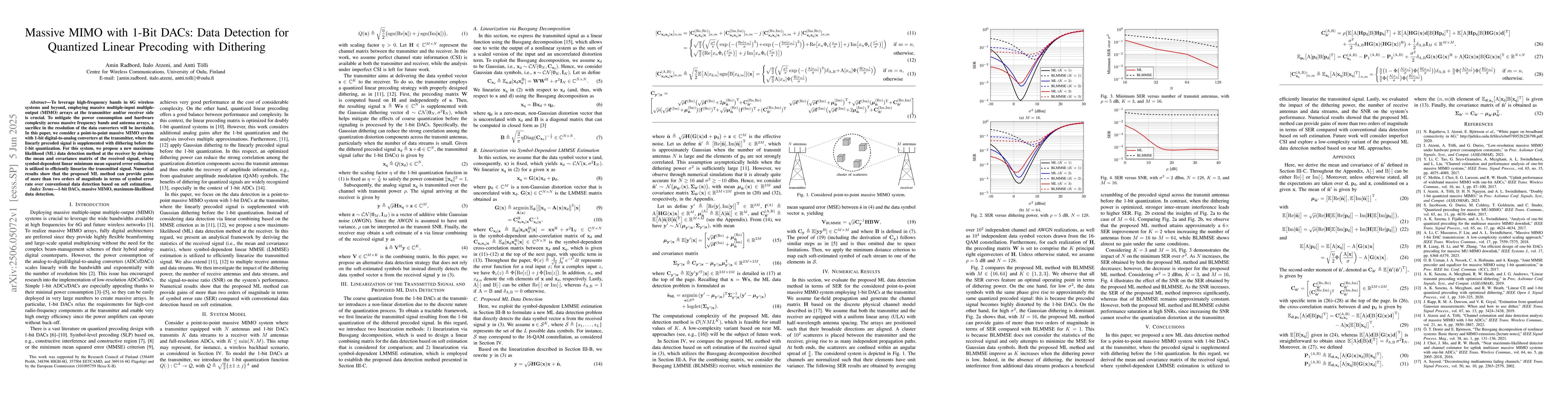 The paper presents a novel maximum-likelihood data detection method for massive MIMO systems with 1-bit DACs, utilizing dithering and symbol-dependent linear minimum mean squared error estimation for efficient linearization.