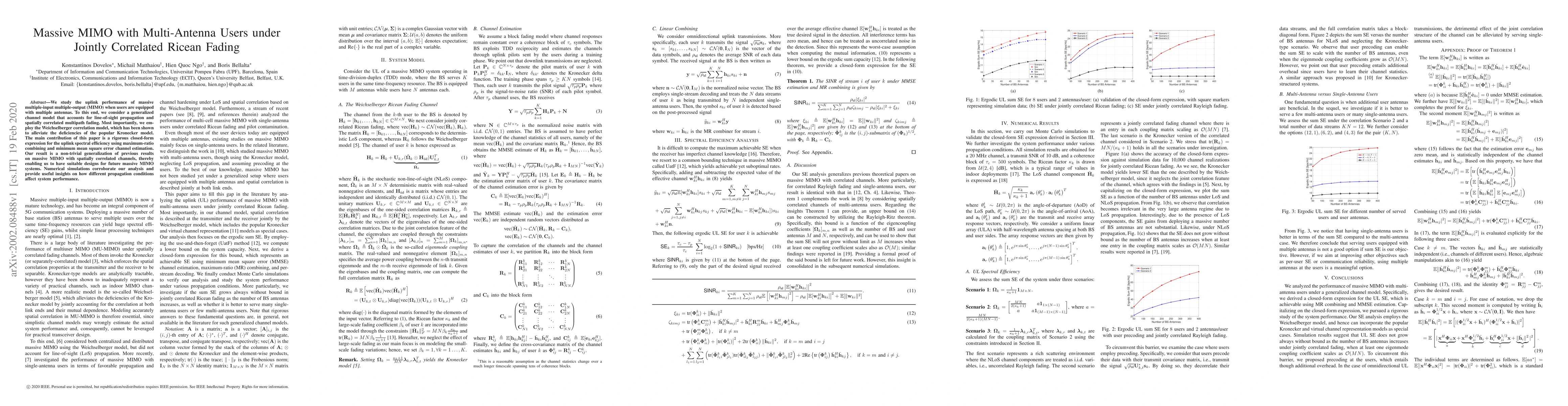 This paper investigates the uplink performance of massive MIMO systems with multi-antenna users under jointly correlated Ricean fading. It provides a closed-form expression for uplink spectral efficiency, improving upon previous models by using the Weichselberger correlation model, and validates the findings through numerical simulations.