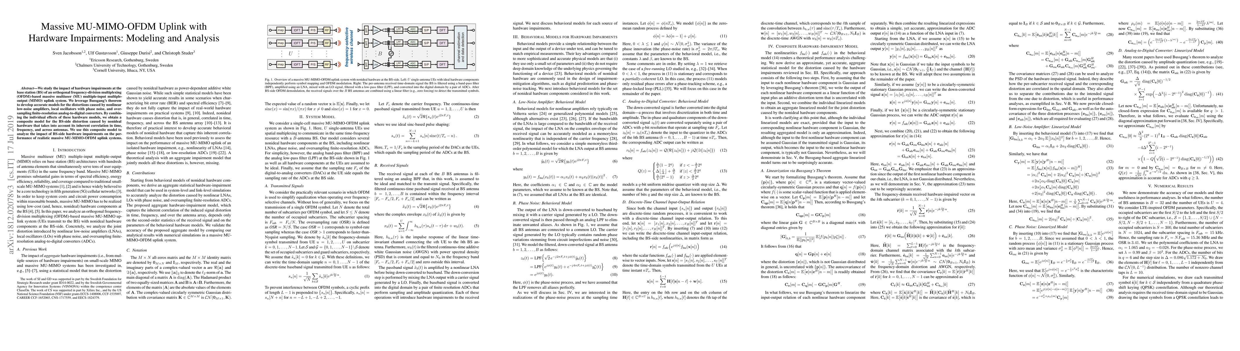 The paper presents a linearized aggregate model for BS-side hardware impairments derived from behavioral models of individual nonlinear hardware components using Bussgang's decomposition.