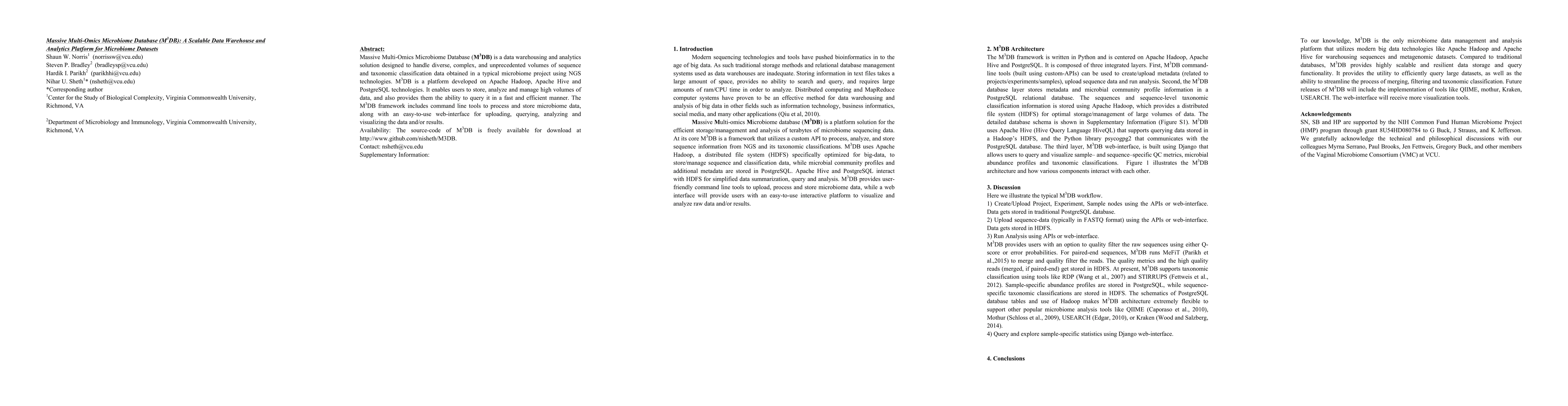 M3DB is a data warehousing and analytics platform built on Hadoop, Hive, and PostgreSQL for managing massive microbiome datasets. It offers command line tools and a user-friendly web interface for data storage, analysis, querying, and visualization.