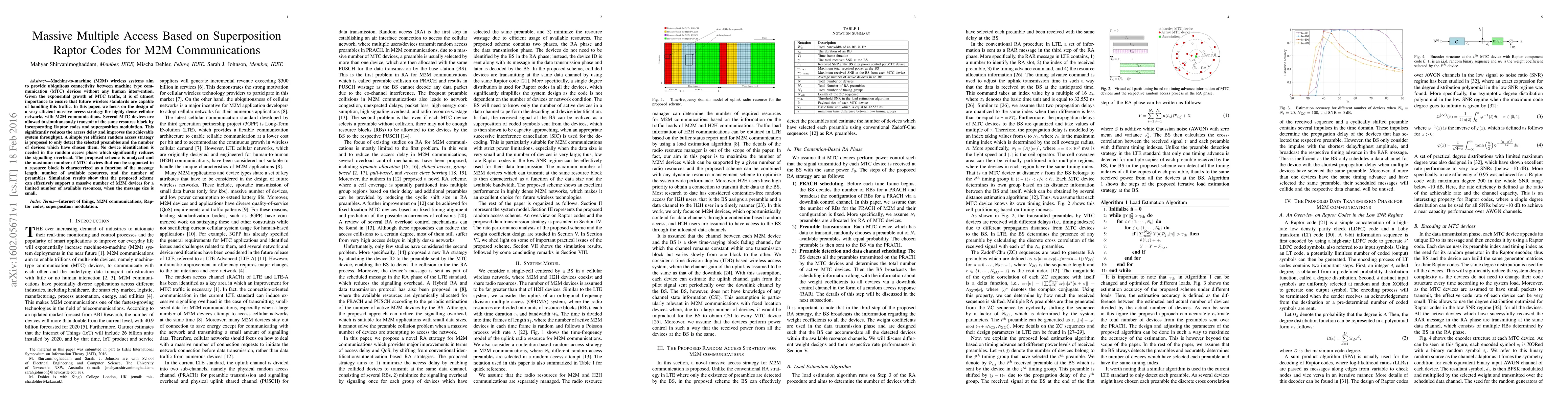 This paper proposes a massive multiple access strategy for M2M communications using superposition Raptor codes and modulation, significantly reducing access delay and improving throughput. The scheme employs a simple random access method that detects selected preambles without requiring device identification, thus minimizing signaling overhead.