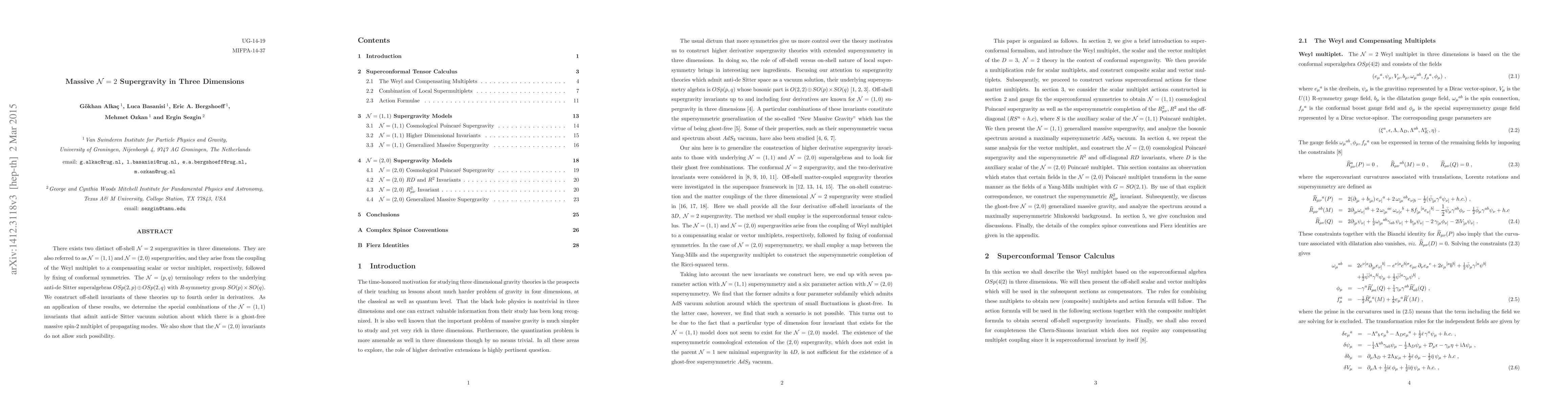 There exists two distinct off-shell ${\mathcal{N}}=2$ supergravities in three dimensions. They are also referred to as ${\mathcal{N}}=(1,1)$ and ${\mathcal{N}}=(2,0)$ supergravities, and they arise from the coupling of the Weyl multiplet to a compensating scalar or vector multiplet, respectively, followed by fixing of conformal symmetries. The ${\mathcal{N}} =(p,q)$ terminology refers to the underlying anti-de Sitter superalgebras $OSp(2,p) \oplus OSp(2,q)$ with $R$-symmetry group $SO(p) \times SO(q)$. We construct off-shell invariants of these theories up to fourth order in derivatives. As an application of these results, we determine the special combinations of the ${\mathcal{N}}=(1,1)$ invariants that admit anti-de Sitter vacuum solution about which there is a ghost-free massive spin-2 multiplet of propagating modes. We also show that the ${\mathcal{N}}=(2,0)$ invariants do not allow such possibility.
