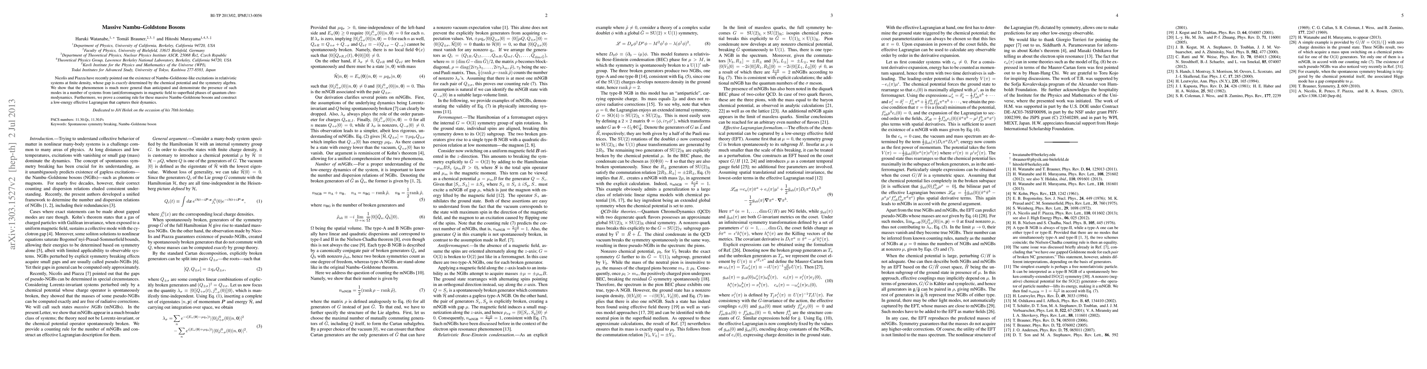 This paper explores the widespread occurrence of Nambu-Goldstone-like excitations in relativistic systems at finite density, demonstrating their existence across various systems including (anti)ferromagnets and superfluid phases. The authors establish a counting rule for these massive modes and develop a low-energy effective Lagrangian to describe their dynamics.
