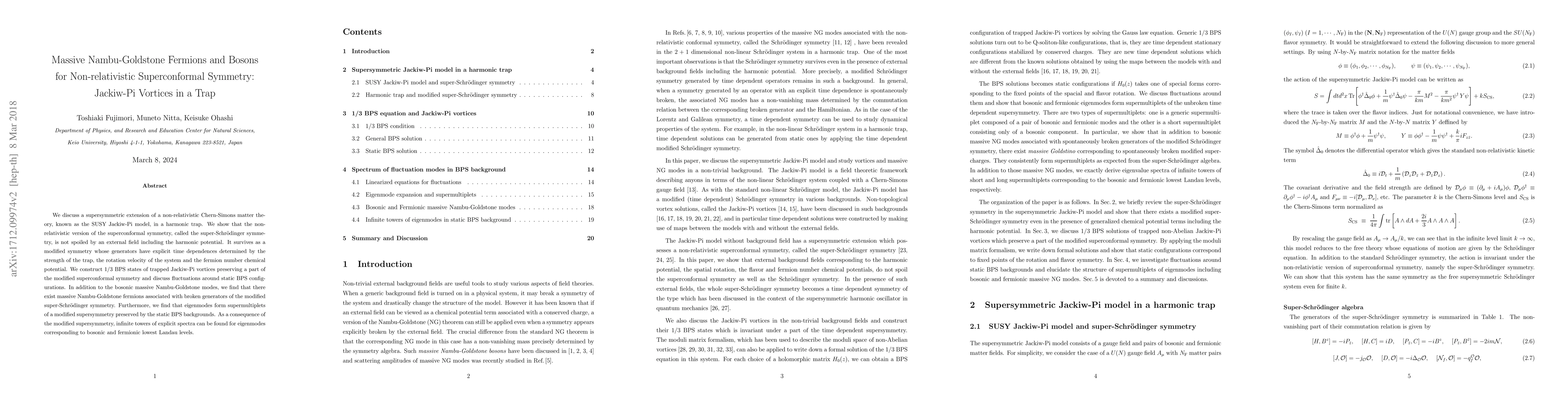We discuss a supersymmetric extension of a non-relativistic Chern-Simons matter theory, known as the SUSY Jackiw-Pi model, in a harmonic trap. We show that the non-relativistic version of the superconformal symmetry, called the super-Schr\"odinger symmetry, is not spoiled by an external field including the harmonic potential. It survives as a modified symmetry whose generators have explicit time dependences determined by the strength of the trap, the rotation velocity of the system and the fermion number chemical potential. We construct 1/3 BPS states of trapped Jackiw-Pi vortices preserving a part of the modified superconformal symmetry and discuss fluctuations around static BPS configurations. In addition to the bosonic massive Nambu-Goldstone modes, we find that there exist massive Nambu-Goldstone fermions associated with broken modified super-Schr\"odinger symmetry generators. Furthermore, we find that eigenmodes form supermultiplets of a modified supersymmetry preserved by the static BPS backgrounds. As a consequence of the modified supersymmetry, infinite towers of explicit spectra can be found for eigenmodes correspond- ing to bosonic and fermionic lowest Landau levels.